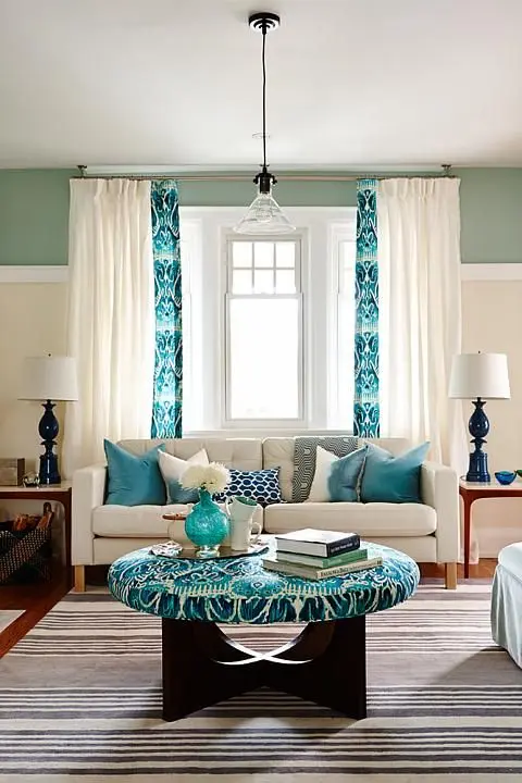 Combinati turcoazul cu pastelurile in special in camere bine iluminate, eventual cu ferestre largi, perdelele sau draperiile turcoaz sunt o varianta buna mai ales daca va doriti sa obtineti un decor cu influente marine, ele putand fi astfel usor accesorizate.