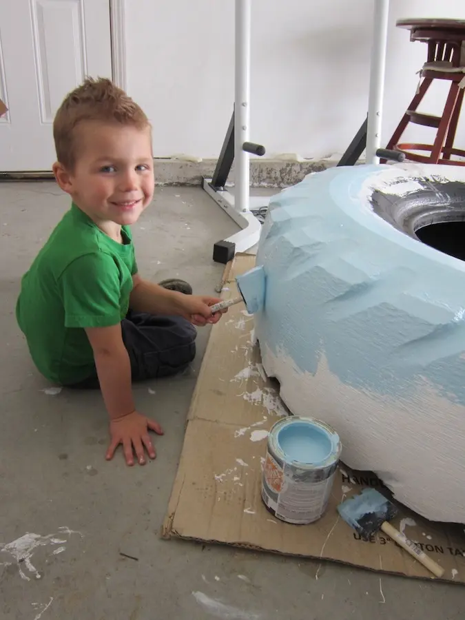 Aveti nevoie, in primul rand de un cauciuc mare, preferabil de la un tractor. Sunt cele mai potrivite pentru ca ofera un spatiu mai larg de joaca. Il puteti gasi la o vulcanizare, un service auto sau chiar la un cimitir de masini. Este important sa curatati cauciucul foarte bine de orice impuritati, apoi vopsiti-l. Aici intervine partea interactiva cand ii puteti implica pe cei mici. Alegeti o culoare potrivita si umpleti de culoare noua groapa de nisip. Cei mici isi pot lasa “amprentele” pe noua lor sursa de joaca.