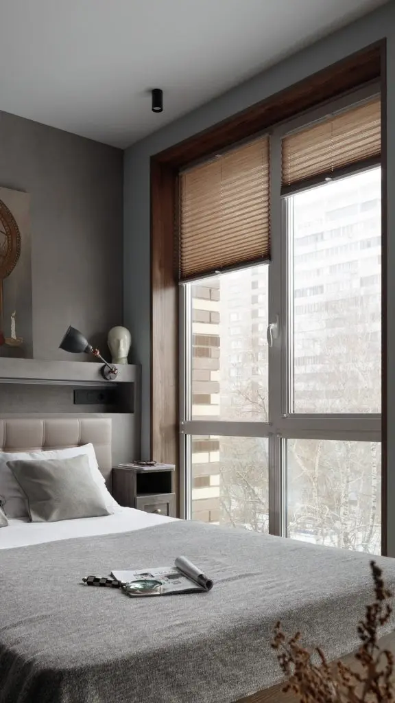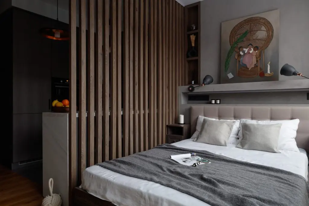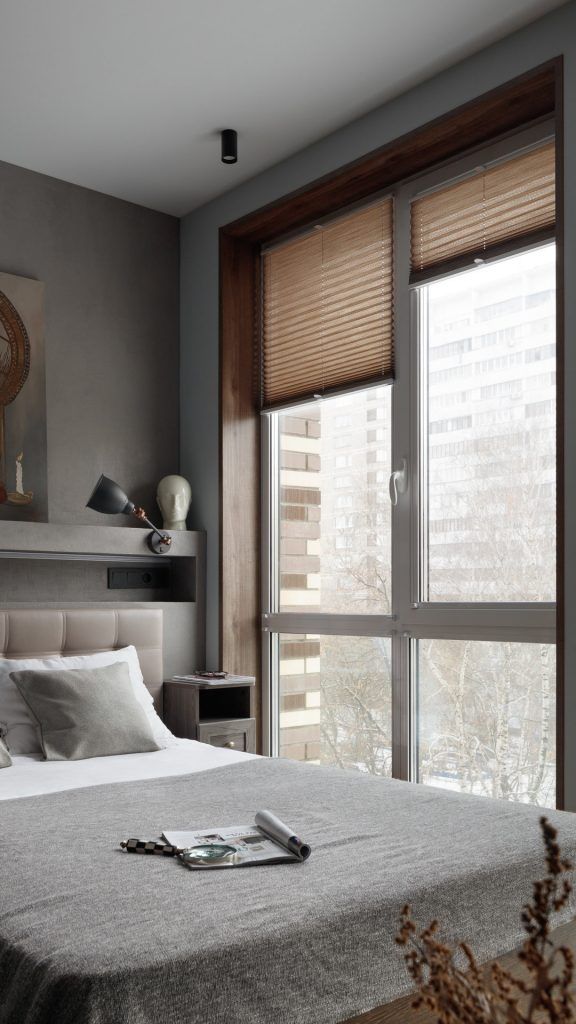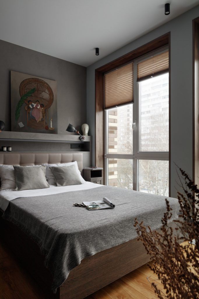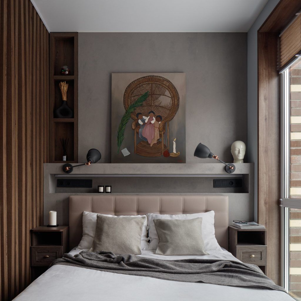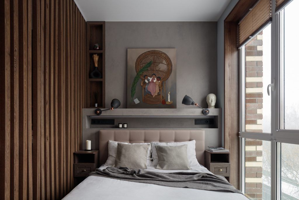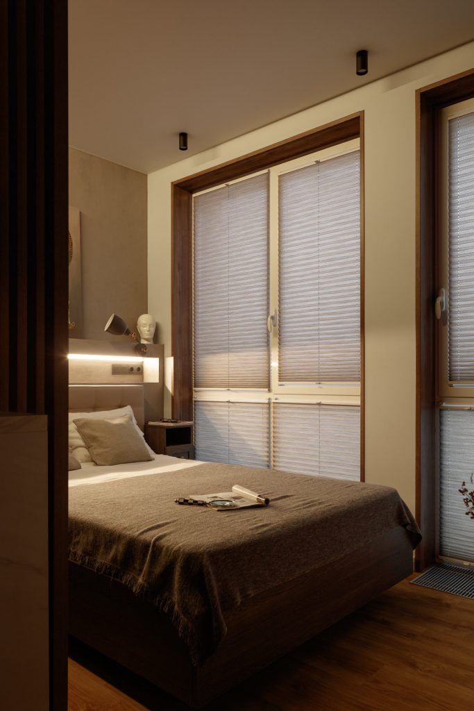 In dormitor a fost realizata o nisa decorativa pe peretele cu tablia patului , in care au fost integrate prizele si intrerupatoarele si un mini dulap incastrat realizat la comanda, din lemn pentru carti si obiecte decorative. Acelasi tip de ancadrament de lemn a fost creat la ferestre, pastrand armonia vizuala.