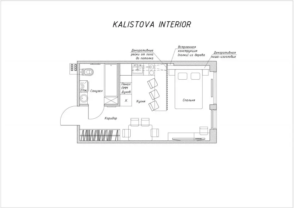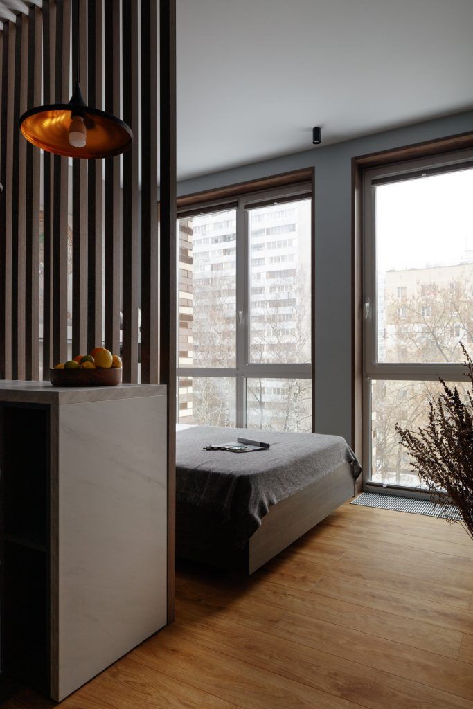 Spatiul disponibil a fost ditribuit intr-un hol compact, bucatarie cu bar/birou separate de dormitor printr-un riflaj de lemn, o zona de luat masa si o baie. Rezultatul amenajarii este un spatiu compact, functional, cu o geometrie simpla, clara, in care prioritatea este confortul proprietarilor.