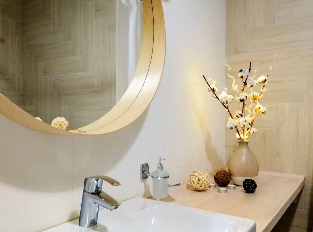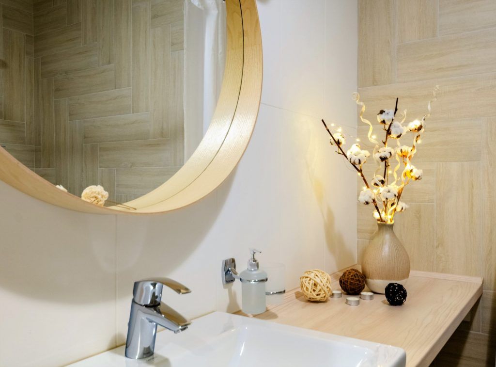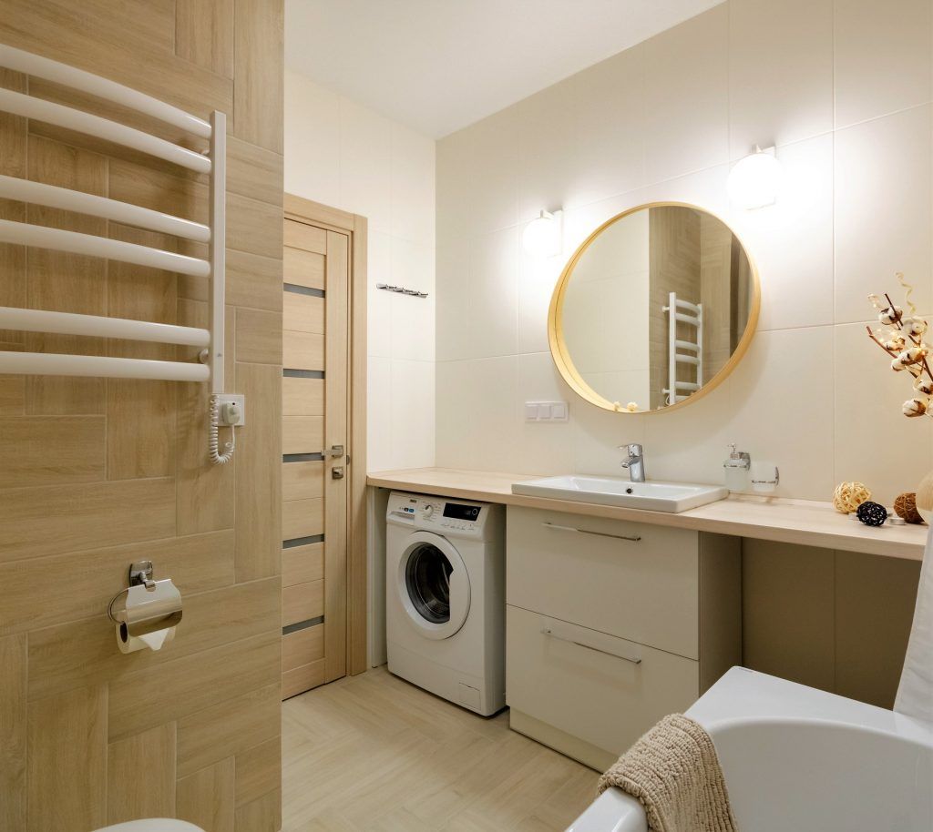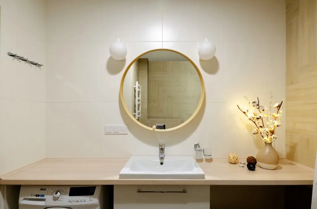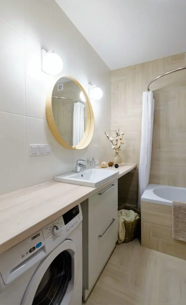 In baie au implementat aceeasi idee cu un blat lung, sub care au instalat masina de spalat rufe, sertare de depozitare sub chiuveta si spatiu pentru rufe. Oglinda rotunda, cu rama din lemn, pune in valoare intreaga compozitie a acestui perete. Baia devine la randul ei, un loc relaxant si placut vizual.