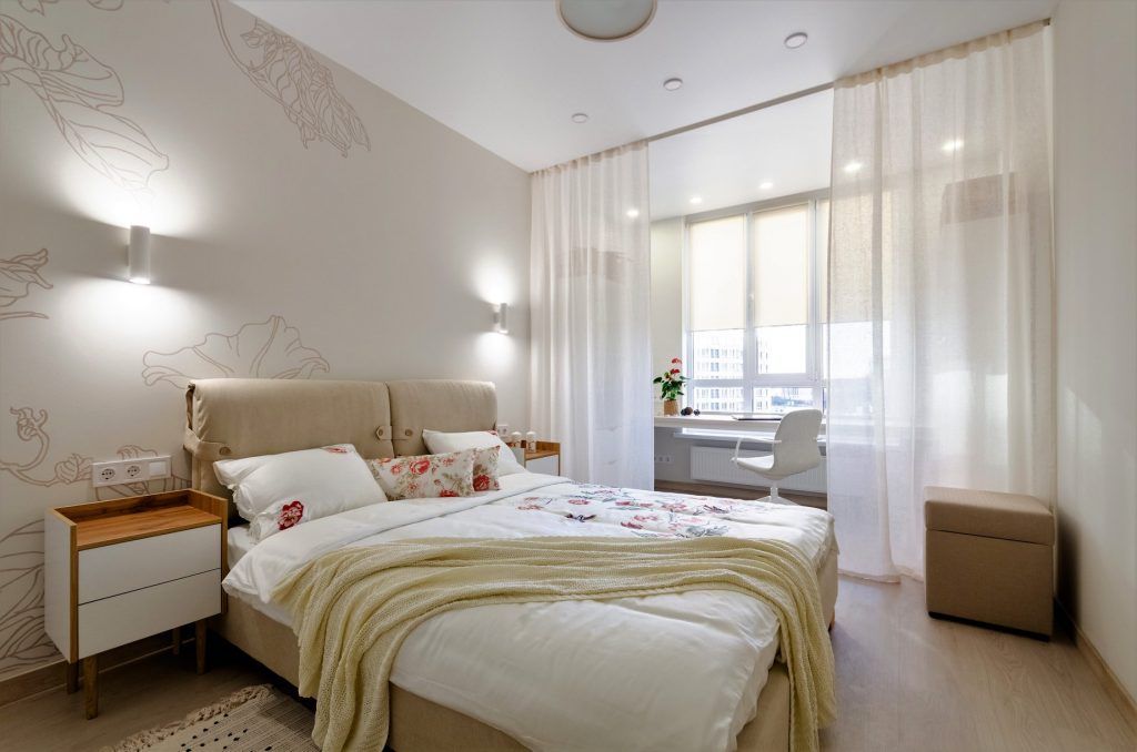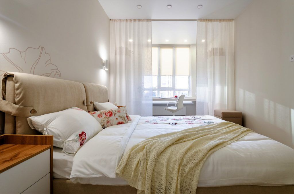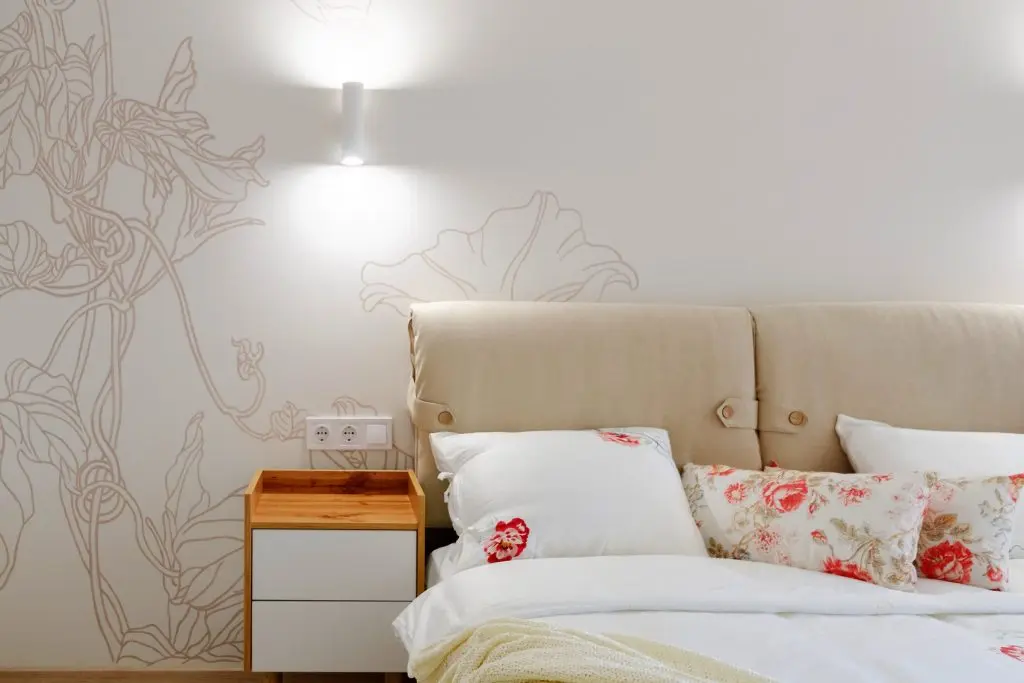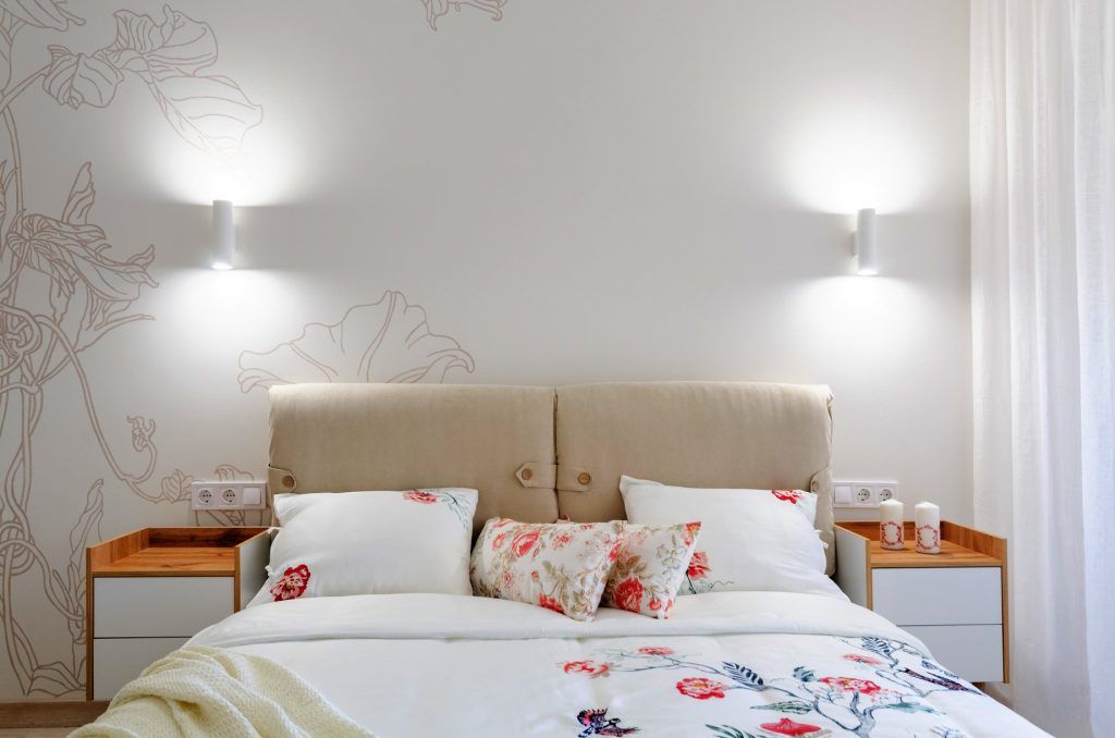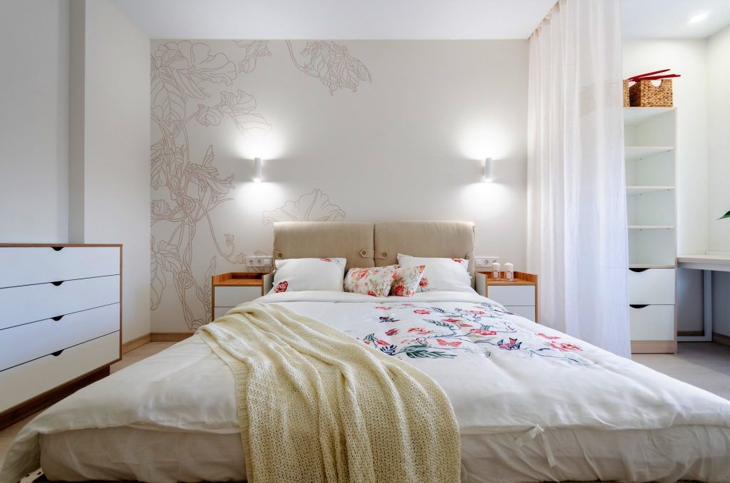 Dormitorul prezinta linii simple, curate, nu au dorit sa incarce inutil spatiul. Patul tapitat cu stofa este centrul atentiei, pus in valoare de peretele din spate, cu un model decorativ desenat chiar de client.