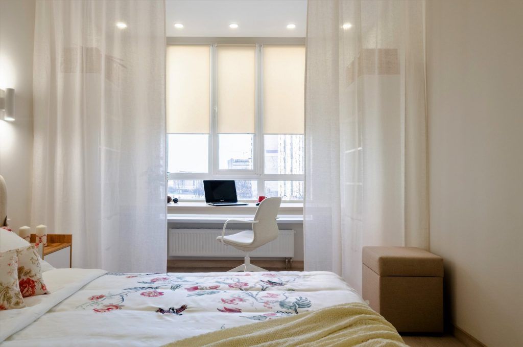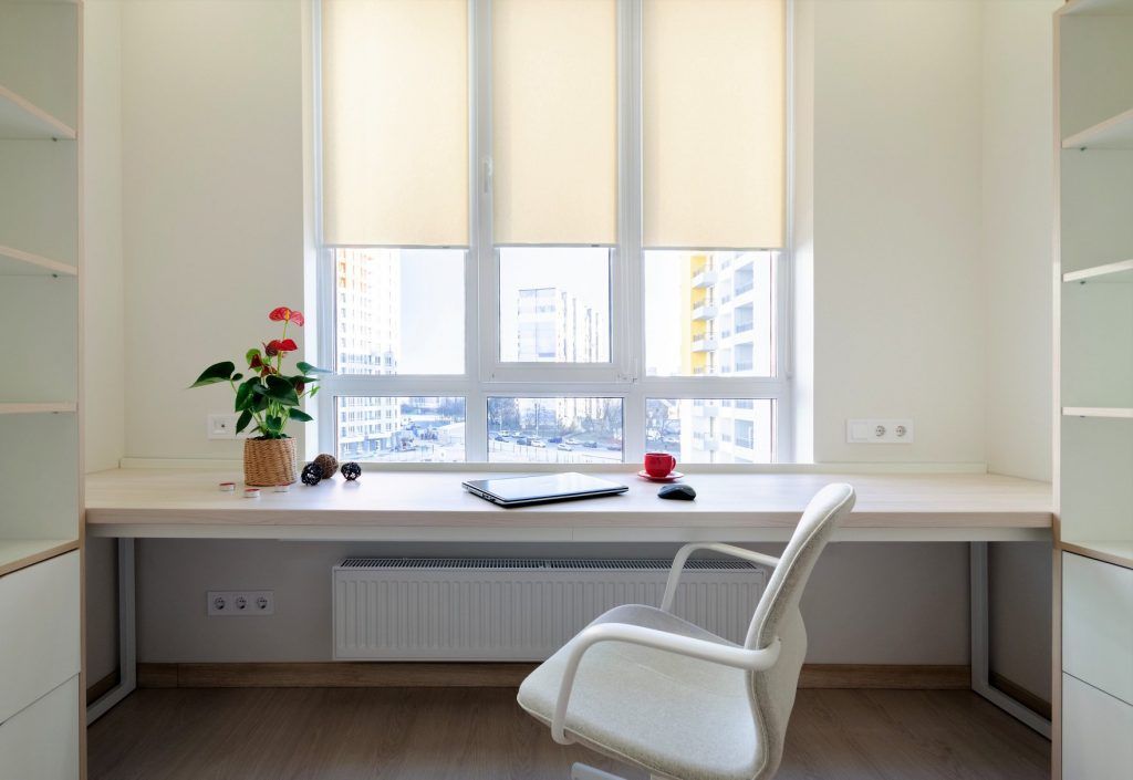 Zona de lucru, langa fereastra, ofera o priveliste incantatoare asupra orasului. Biroul de lungimea peretelui este delimitat de cele doua corpuri de mobilier amplasate simetric, cu multe rafturi de depozitare.