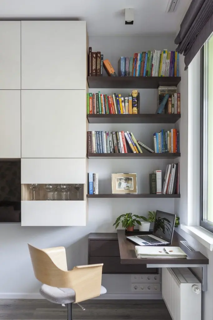 Pentru partea de living, s-a optat pentru o mobilare sumara, cu corpuri suspendate si rafturi de o parte si o canapea de cealalta parte. In dreptul ferestrei, un mic spatiu de lucru a fost conturat, mergand pe aceeasi idee de piese suspendate, pastrand pardoseala libera.
