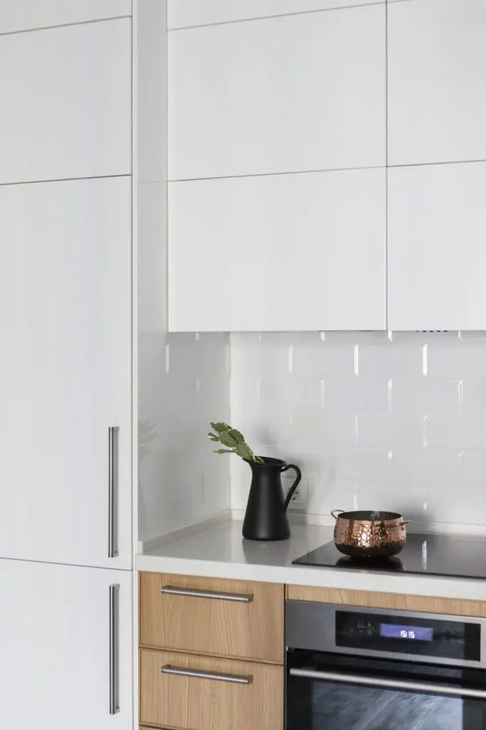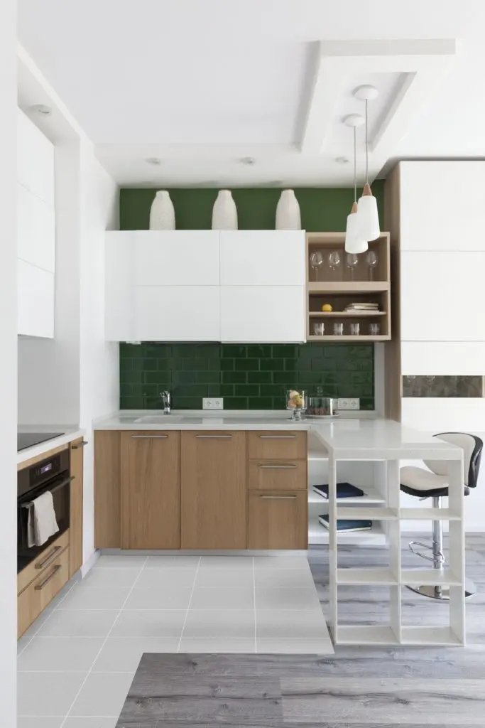 Corpurile din bucatarie au fost realizate pe comanda, partea superioara cu fronturi albe, iar cea inferioara cu front din lemn natur. La mijloc, a fost ales un brau din placi ceramice verzi care sa atraga privirea si sa sparga din monotonia albului; si partea vizibila din perete (cea inspre tavan) a fost zugravita si ea cu verde ca intr-un soi de continuitate. Toate electrocasnicele sunt incorporate, pastrand un aspect unitar, ordonat. Cea de-a treia latura a bucatariei o reprezinta o zona de luat masa tip bar, cu alte spatii de depozitare ingenios integrate.