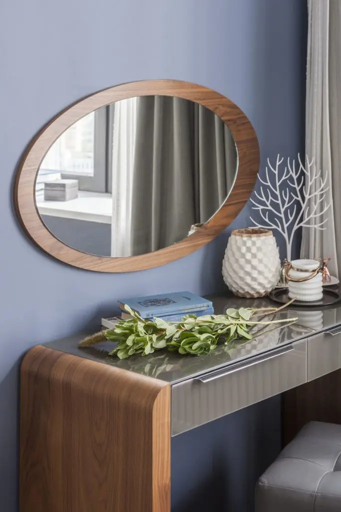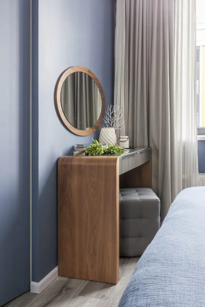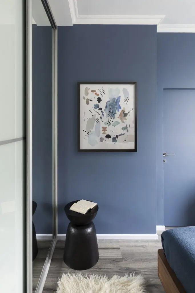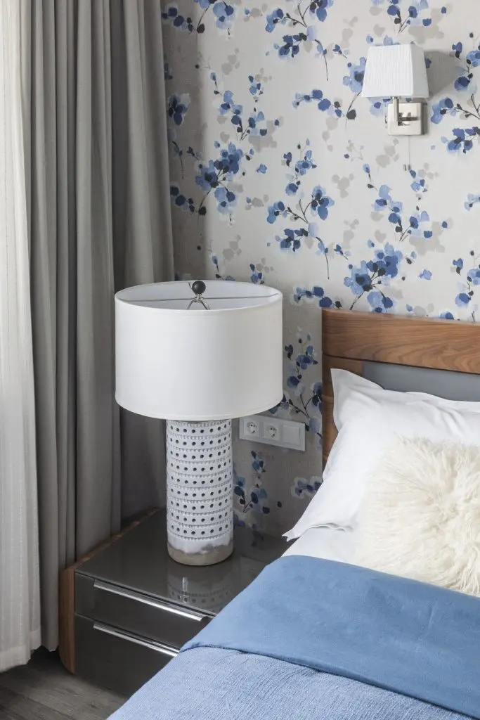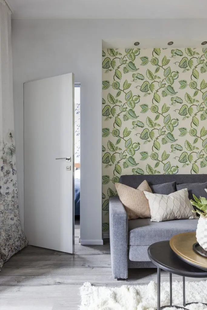 Accesul in dormitor se face direct din living, designerul optand pentru o usa invizibila. In cei 12 metri patrati, s-a putut contura un decor placut, linistitor. Tapetul cu motiv floral contureaza o zona de accent in jurul patului. Spatiul a permis si integrarea unui dulap pentru haine, dar si un mica zona de make-up.