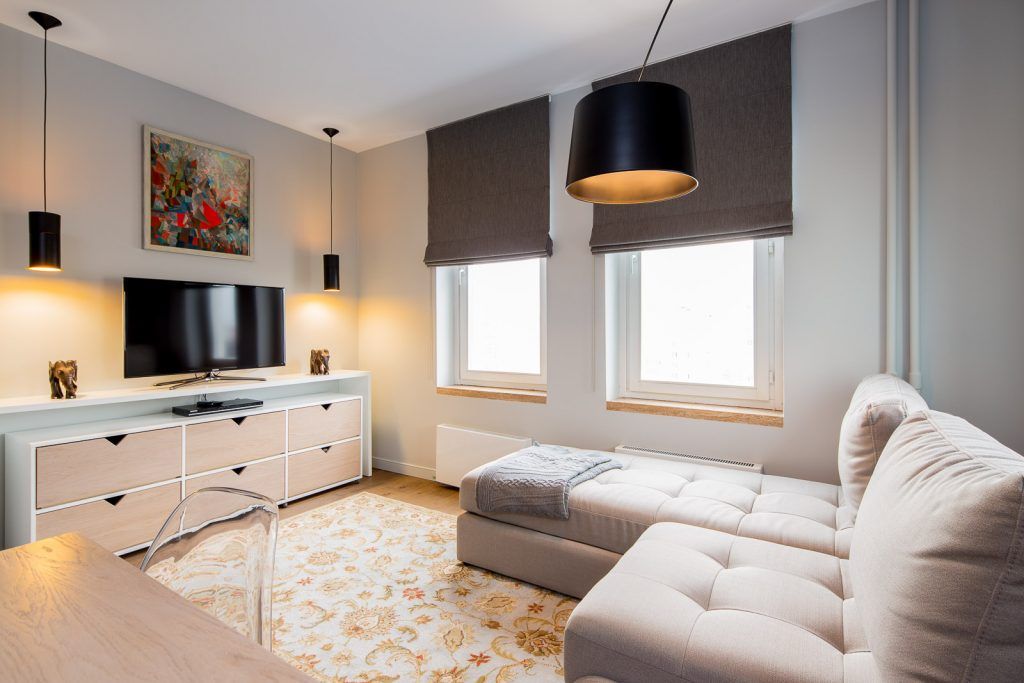 Mica si compacta, bucatariaofera strictul necesar pentru a gati si depozita lucruri specifice acestei zone. Finisajul frontului dintre corpuri este o nuanta cognac superba asemanatoare cu ceea ce vom intalni in baie. Nu putem ignora corpurile de iluminat, cele 3 boluri cu becuri retro, cu filament Edison de deasupra diningului sau cele doua corpuri suspendate simetric asezate de o parte si de cealalta a televizorului.