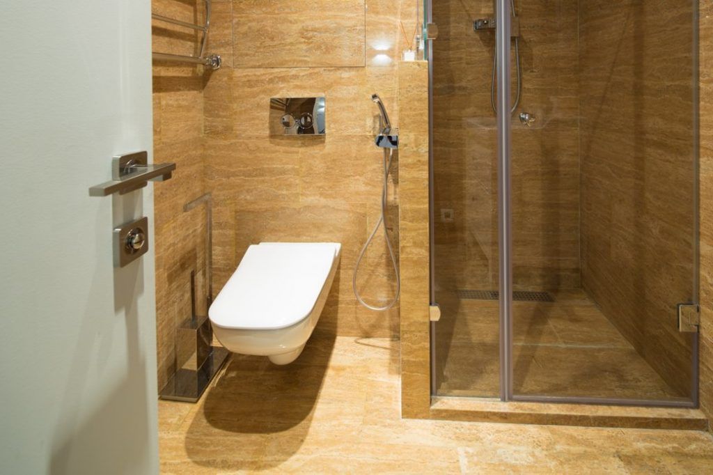 Cromatica placuta, cu nuante calde de crem, bej si gri precum si finisajele din piatra (travertin) din baie sunt excelent imbinate in interiorul decorului.