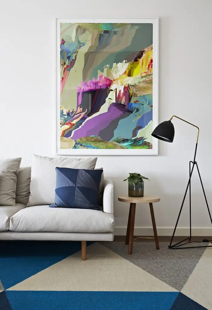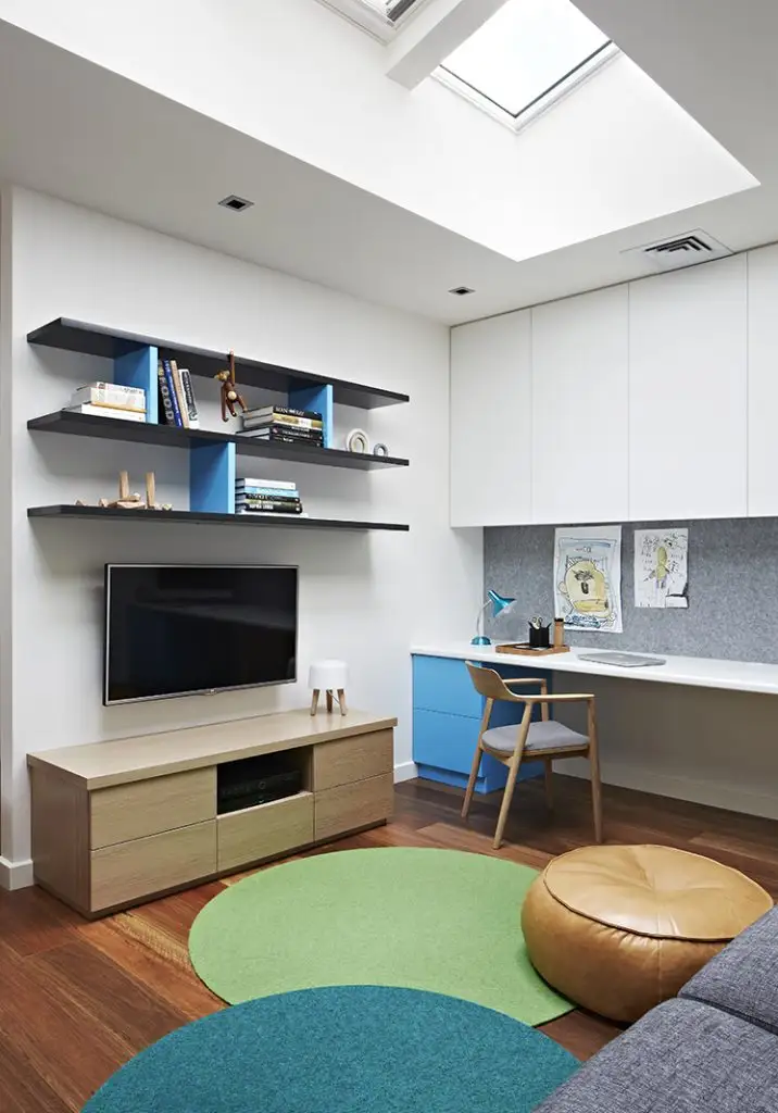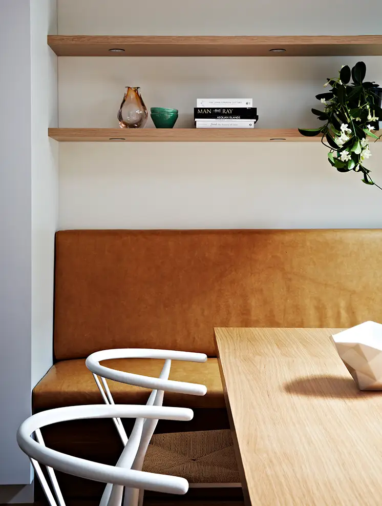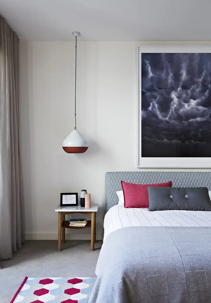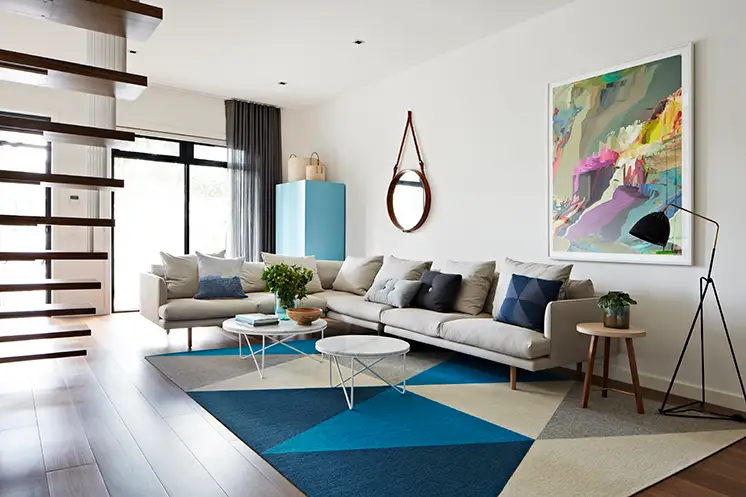 Decorul pastreaza o linie simpla cu alb si nuantele placute ale lemnului, precum si forme geometrice atat in forma printurilor cat si a liniilor din structura pieselor de mobilier, ale corpurilor de iluminat sau ale decoratiunilor. Petele discrete de culoare imbogatesc dinamismul spatiului de locuit.