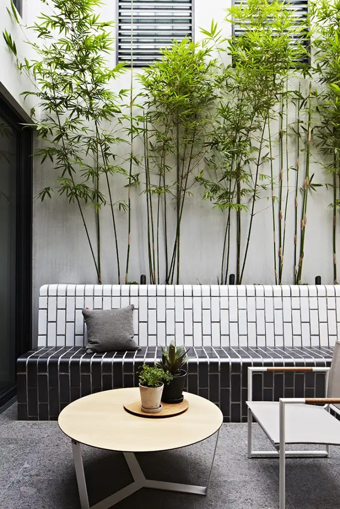 Pentru curtea interioara s-au folosit nuante de gri imbinat cu alb si flise pentru a decora suportul pentru plante si bancuta din fata lui. Inaltimea palmierilor merge pana sus la balcoanele dormitoarelor de la etajal , decorand astfel peretele inalt de beton.