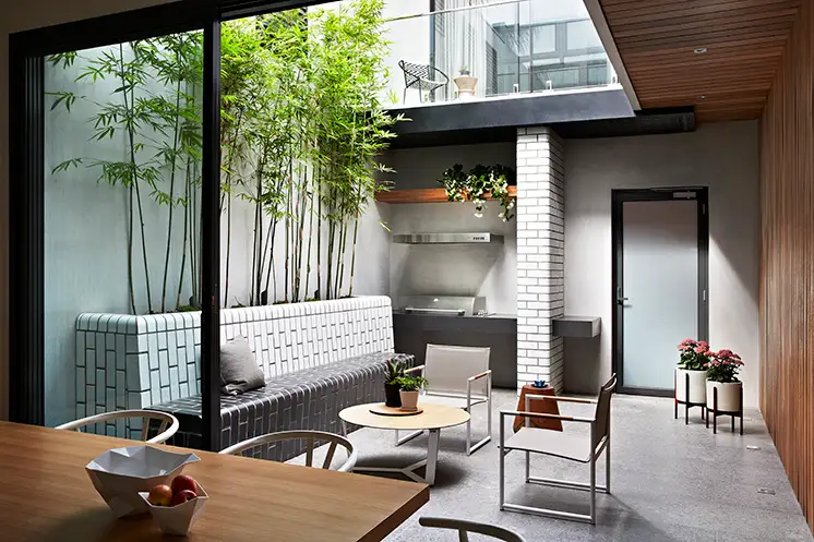 Locuinta urbana cu design modern vedere din bucatarie spre curtea interioara