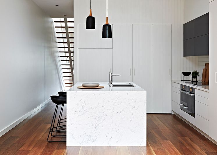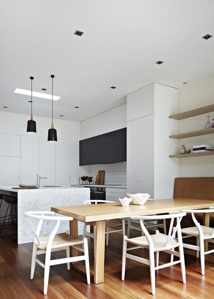 Bucataria este fara doar si poate una din piesele de rezistenta ale reamenajarii. Mobilierul negru, peretele placat cu lemn si vopsit in alb cu diferite spatii de depozitare inzidite si insula din marmura, precum si negrul dulapurilor superioare, al scaunelor si al corpurilor de iluminat fac din acest spatiu al casei preferatul nostru.