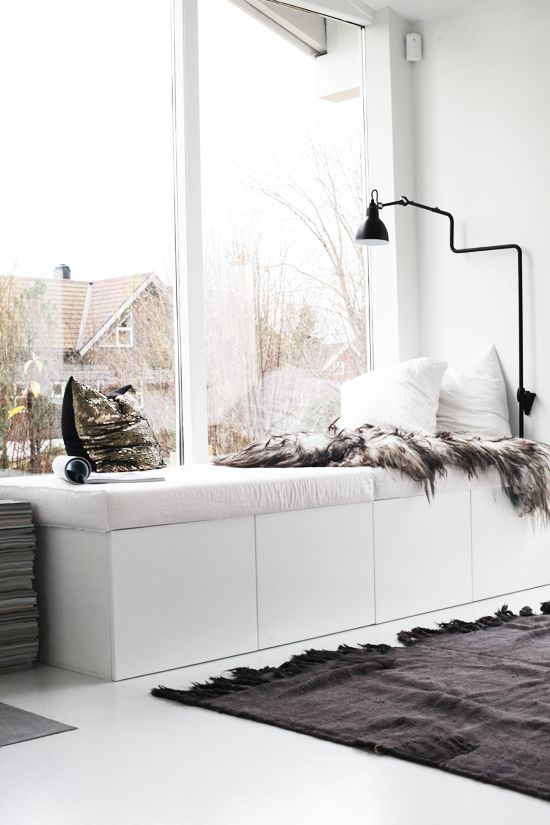 Atunci cand parapetul geamului (adica distanta dintre pardoseala si pervaz) este mai inalta de 45 cm si nu exista calorifer, o bancheta poate fi solutia perfecta. Ideal ar fi sa fie incadrata stanga-dreapta de corpuri de mobilier si/sau perete, pentru a putea sta rezemat in timp ce citesti sau admiri privelistea. In plus, banca o poti folosi si pentru depozitare.