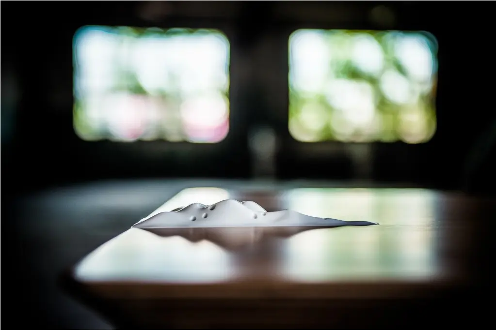 Dar elementul de surpriza este altul. Masa X are incorporata in tablie o prisma alba cu o suprafata abstracta, perforata pe care noi initial am considerat-o „the artist’s touch”. Si chiar e evorba de o atingere. Pentru ca, la o simpla atingere a micului intrerupator mascat, de pe suprafata interioara a acestei prisme, ea se transforma intr-o lampa.