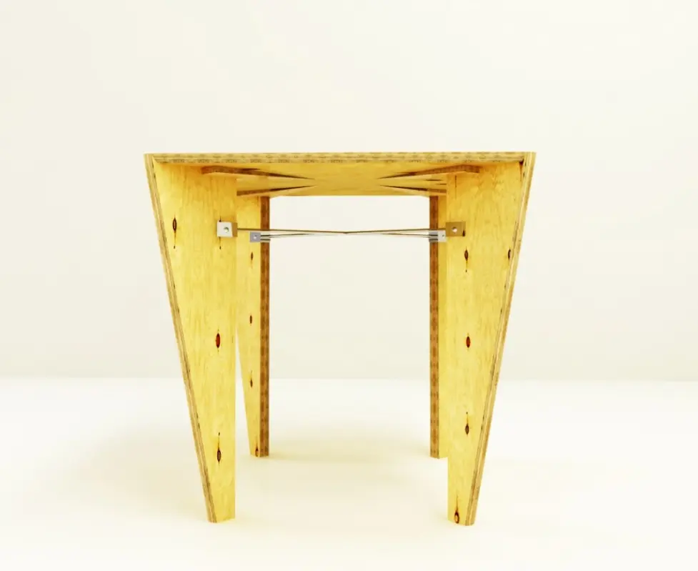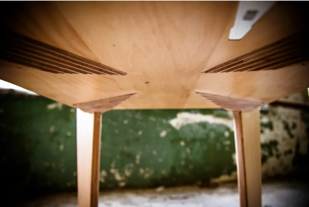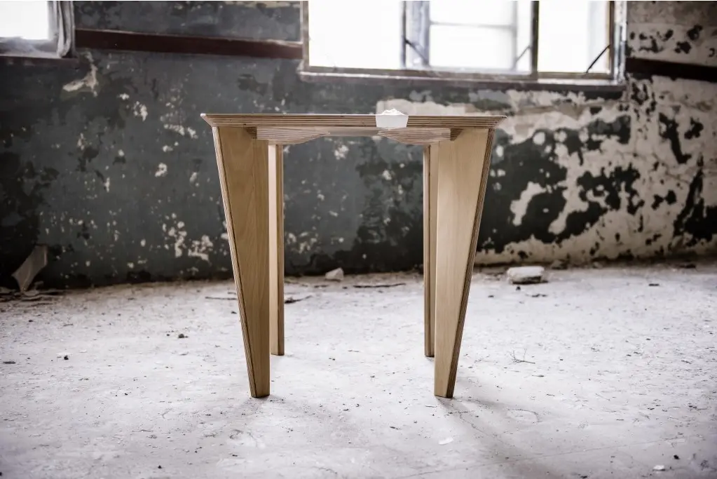 Am aflat ca masa se numeste X si este o lucrare de design de obiect, rezultat al colaborarii dintre Z ES T Collective si fabricatia Kaustik. Este realizata din lemn stratificat si este finisata manual, iar designul pune in evidenta calitatile materialului prin imbinarea picioarelor cu blatul patrat al mesei astfel incat fibra lemnului stratificat sa fie aparenta in suprafata blatului.