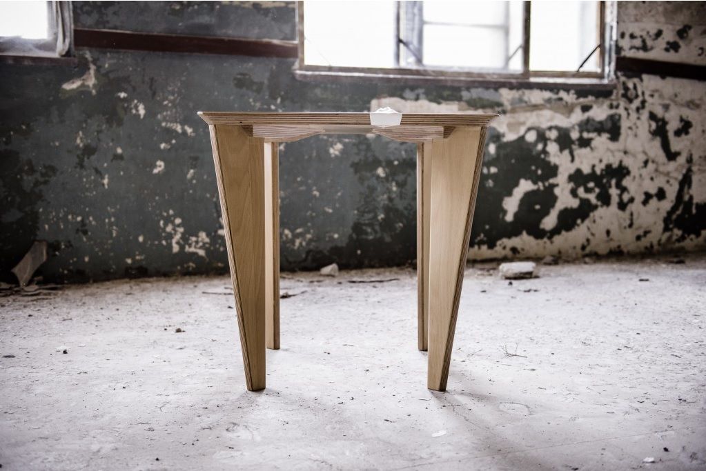 Am aflat ca masa se numeste X si este o lucrare de design de obiect, rezultat al colaborarii dintre Z ES T Collective si fabricatia Kaustik. Este realizata din lemn stratificat si este finisata manual, iar designul pune in evidenta calitatile materialului prin imbinarea picioarelor cu blatul patrat al mesei astfel incat fibra lemnului stratificat sa fie aparenta in suprafata blatului.
