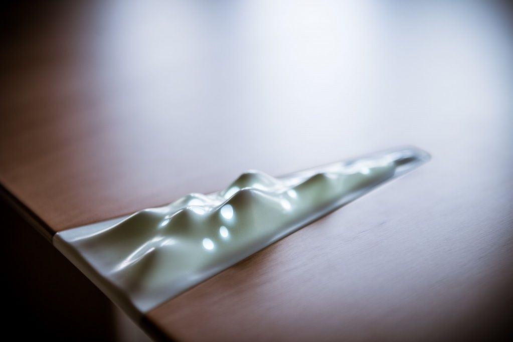 Dar elementul de surpriza este altul. Masa X are incorporata in tablie o prisma alba cu o suprafata abstracta, perforata pe care noi initial am considerat-o „the artist’s touch”. Si chiar e evorba de o atingere. Pentru ca, la o simpla atingere a micului intrerupator mascat, de pe suprafata interioara a acestei prisme, ea se transforma intr-o lampa.