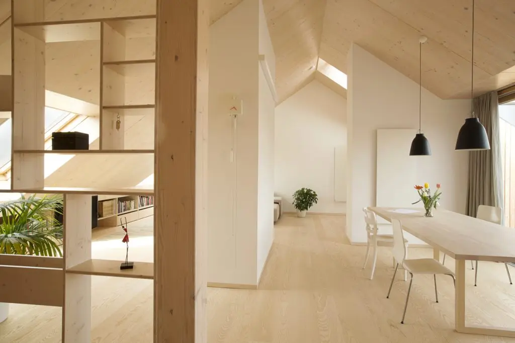 Fiind vorba de un proiect de reconversie, scopul a fost crearea unui volum spatial corespunzator unei locuiri de calitate. Intreaga structura a acoperisului a fost data jos si reconstruita, utilizandu-se placi de furnir. Acestea au atat functia de a suporta incarcatura acoperisului, dar si rolul de a ramane vizibile si la interior, creand o geometrie de forme.