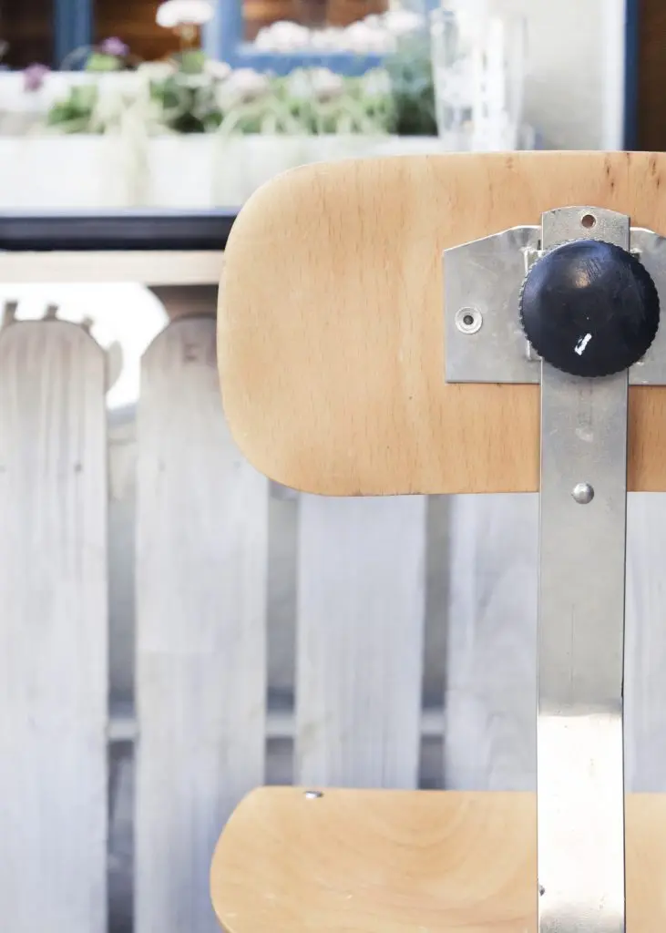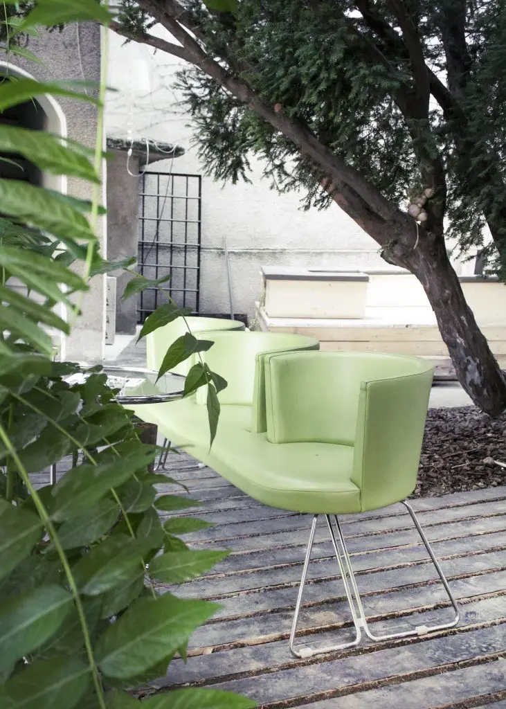 Eclectismul mentionat mai sus se reflecta cel mai mult in alegerea mobilierului. O parte din el fiind cumparat din magazine second-hand si reconditionat, o alta parte a pieselor de mobilier fiind primita de la Spazio Studio, iar printre acestea fiind inserate scaune clasice de gradina.