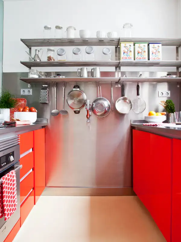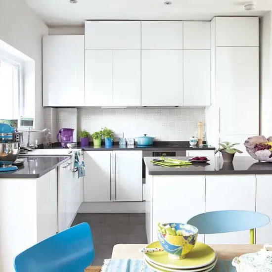 Tine cont de culorile pe care le vei alege in functie de marimea si lumina din incaperea respectiva. Opteaza pentru nuante simple, neutre, alb, crem sau cel mult pasteluri discrete daca ai de-a face cu o bucatarie mica si mai ales nu incarca spatiul cu dulapuri voluminoase. Mergi mai degraba pe ideea unor rafturi deschise.