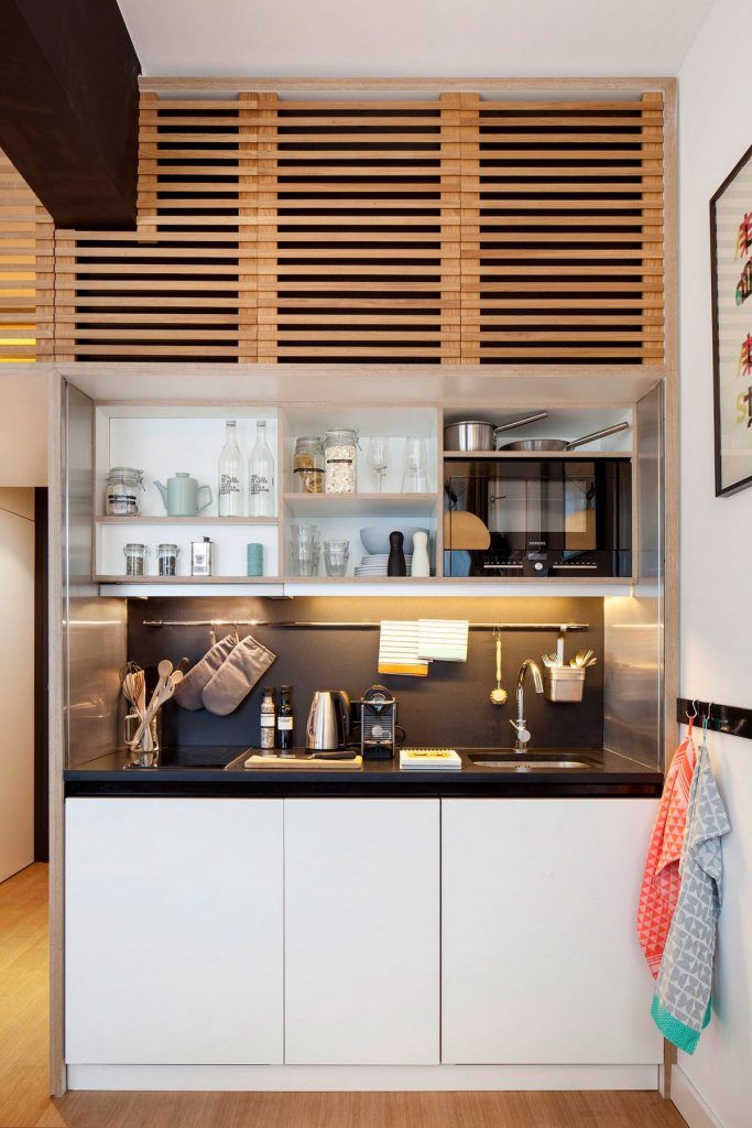 Intregul concept se bazeaza pe incapsulare sau, altfel spus, pe functiuni compacte dotate cu strictul necesar. De la zona de living cu televizor, loc de luat masa, bucatarie pentru gatit, zona de dormit sau birou, precum si locuri pentru depozitare, acest mini apartament le are pe toate ingenios incadrate astfel incat spatiul sa nu para sufocat.