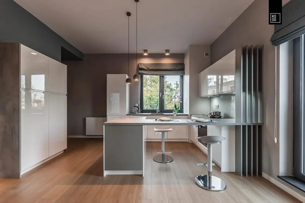 Intreaga amenajare porneste de la baza unei coloristici exprimate prin nuante de alb, gri si lemn natural. Punctul de interes este reprezentat de un spatiu deschis format din bucatarie si living, separarea celor doua incaperi facandu-se subtil prin intermediul unui mini bar cu rol practic, de pregatire sau servire a mesei.