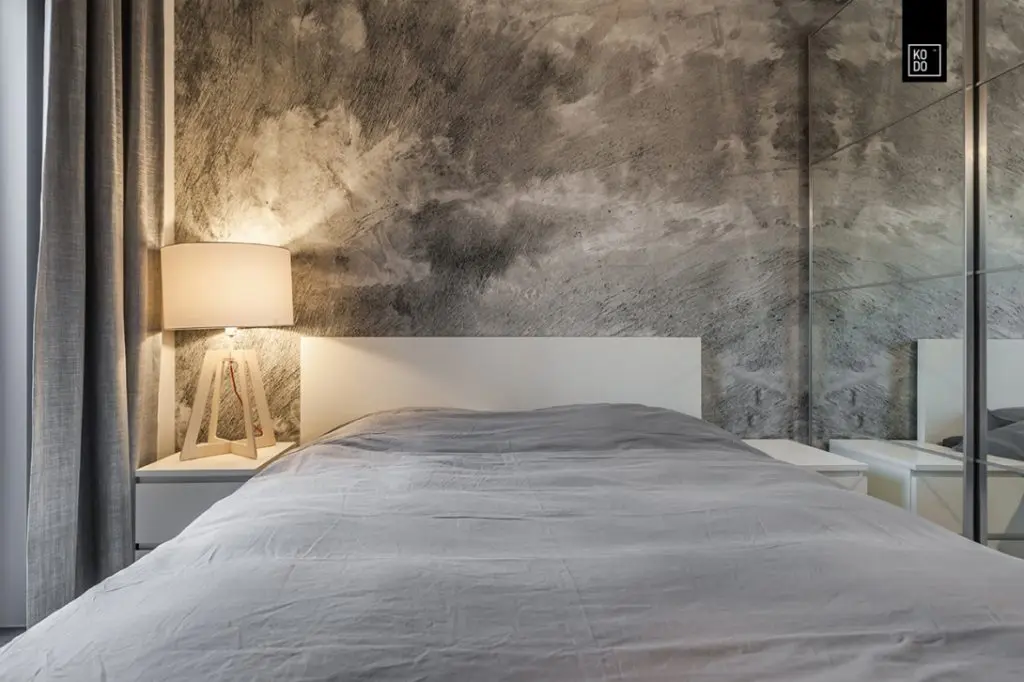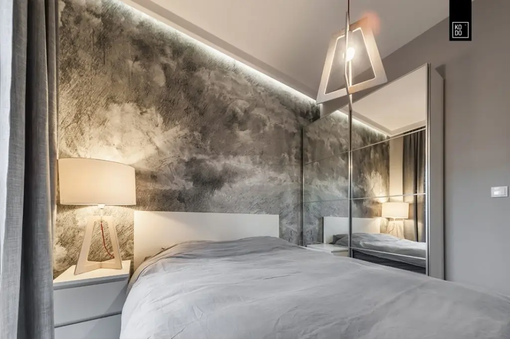 Unul din accentele moderne ale dormitorului apare mai cu seama mural, prin folosirea unui tapet in nuante de gri si texturi marmorate, transpundand fictiv ideea de spatiu ceresc, nori, natura.