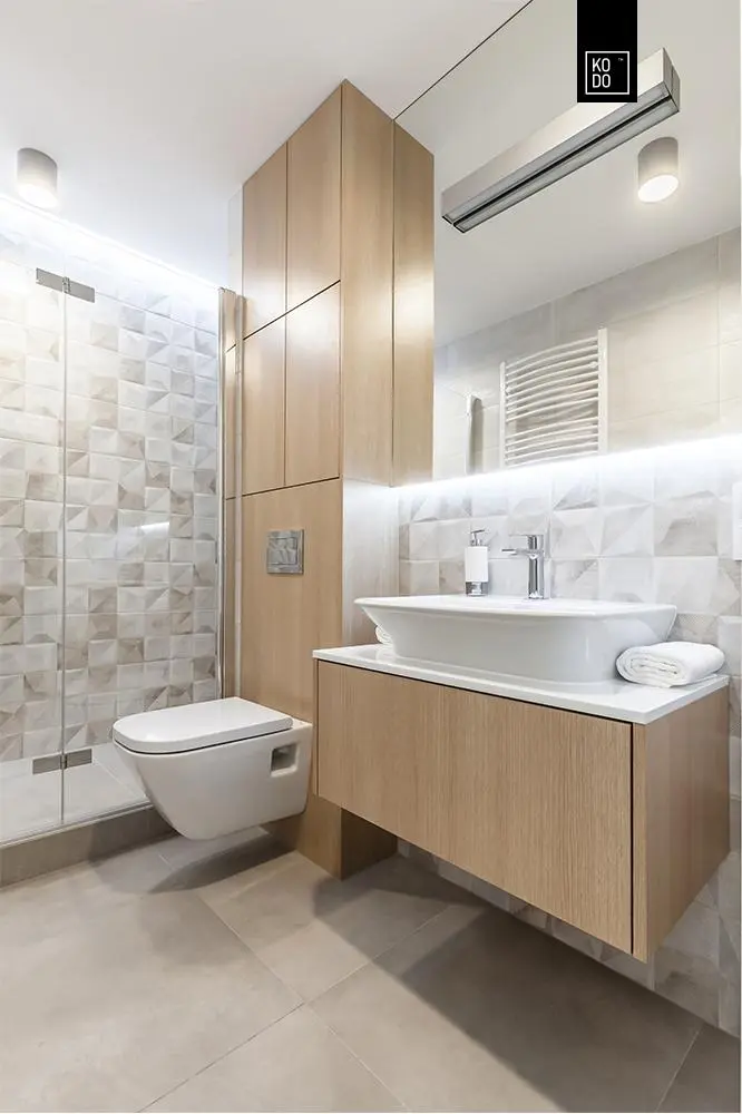 Minimalismul componentelor sanitare, a oglinzii de mari dimensiuni si a benzilor de led pozitionate deasupra lavoarului si in zona cabinei de dus, dau o nota moderna baii.