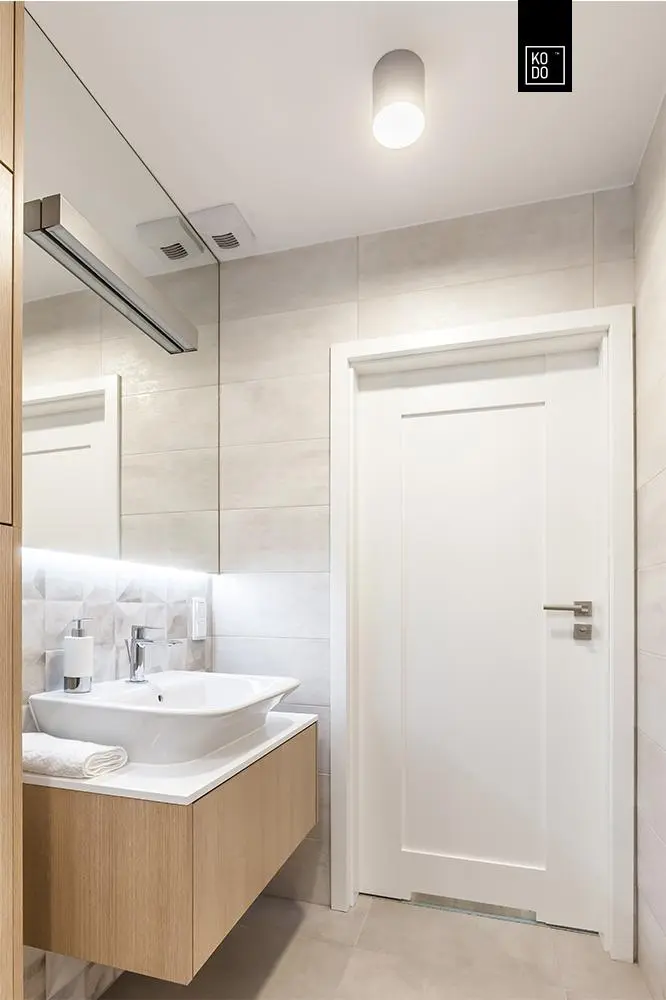 In cazul baii putem observa o camera ingusta, pe lung, diferita de celelalte incaperi. Beige-ul, nude-ul si lemnul natural deschis sunt cele care domina intreaga camera. Mobilierul este unul practic si stilizat astfel incat sa ofere senzatia de continuitate, fiind usor de confundat cu peretii care intra in alcatuirea spatiului.