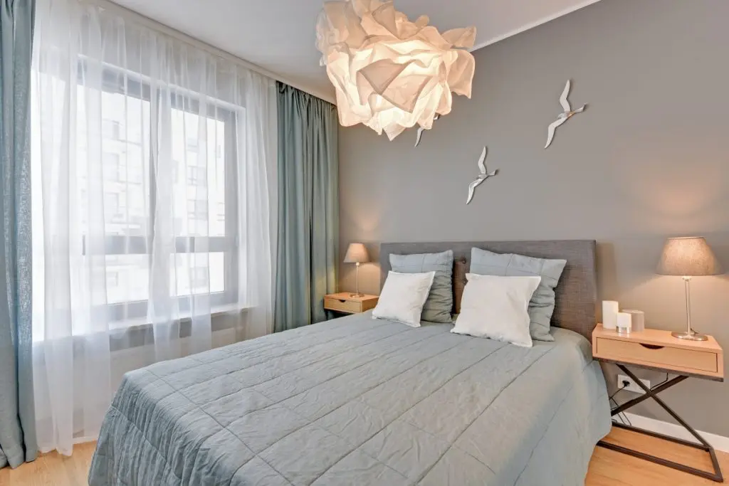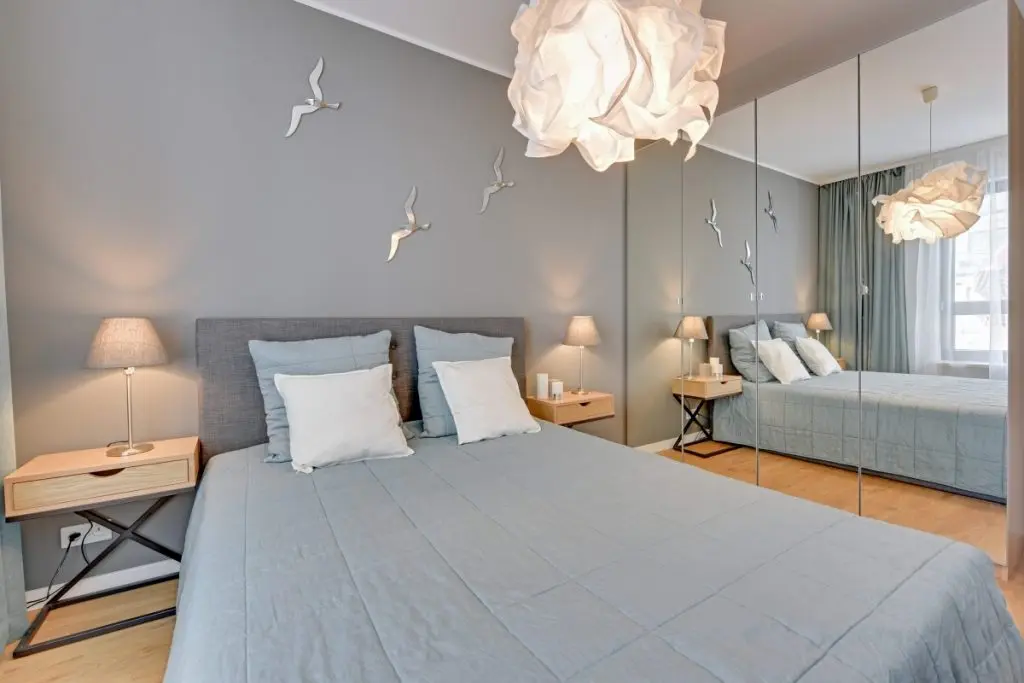 Romantismul este dat fara dar si poate de accesoriile argintii murale care infatiseaza zborul unor pescarusi, accesorii carora li se adauga o lustra abstracta si o draperie din satin.Noptierele asezate pe fiecare laterala a patului aduc cu ele doua veioze de mici dimensiuni cu lumina calda si subtila.