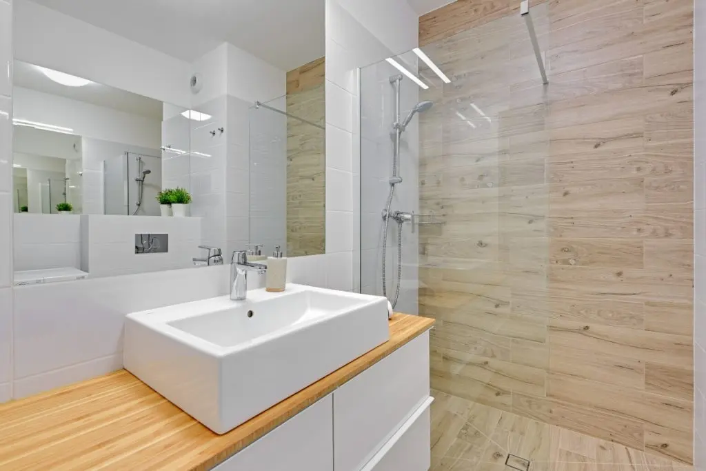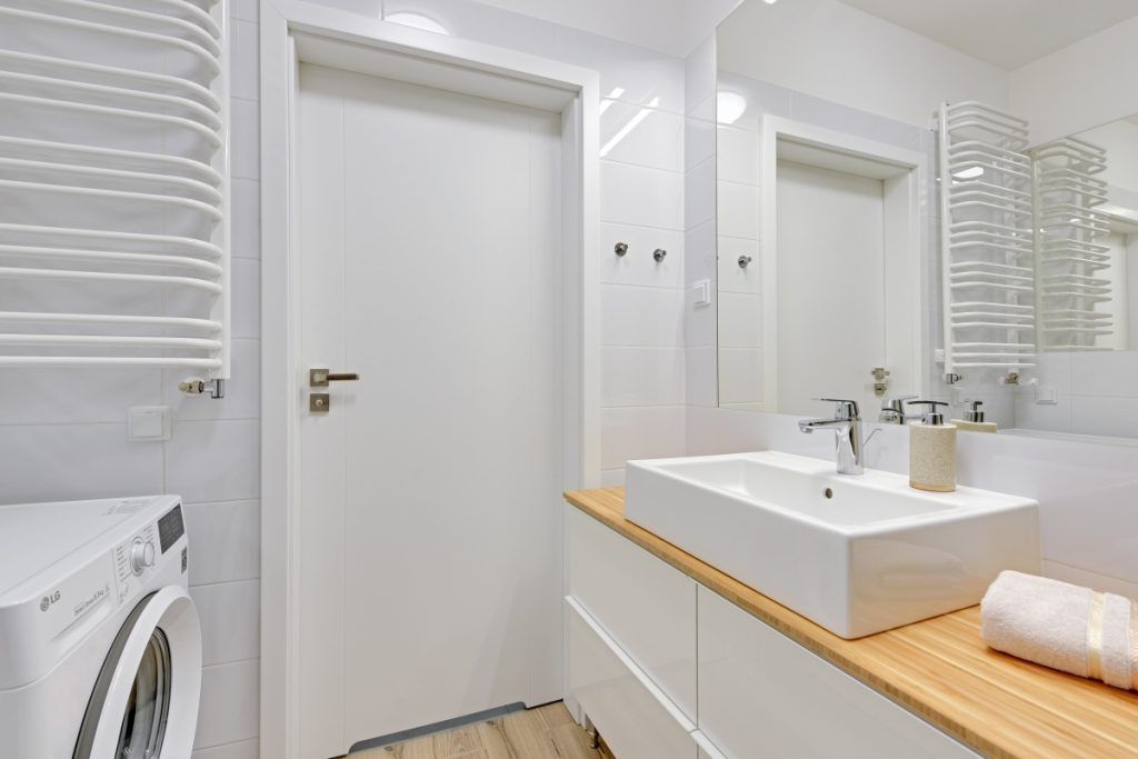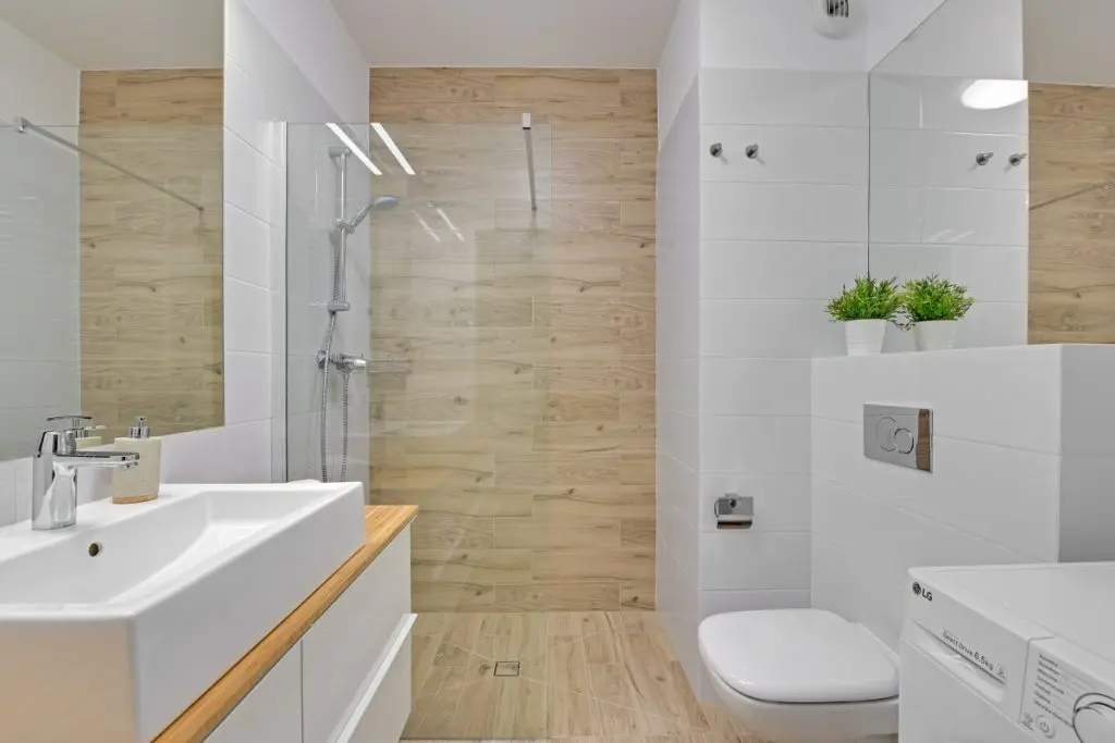 Albul imaculat si folosirea intr-o mare masura a lemnului natural, fac din spatiul baii un loc fresh, perfect pentru relaxare. Cabina de dus, accesoriile sanitare si mobilierul aduc in prim plan accente moderne iar stilul scandinav isi face simtita prezenta prin alegerea plantelor decorative. Si in acest caz iluminatul este unul simplist fiind reprezentat discret de o plafoniera.