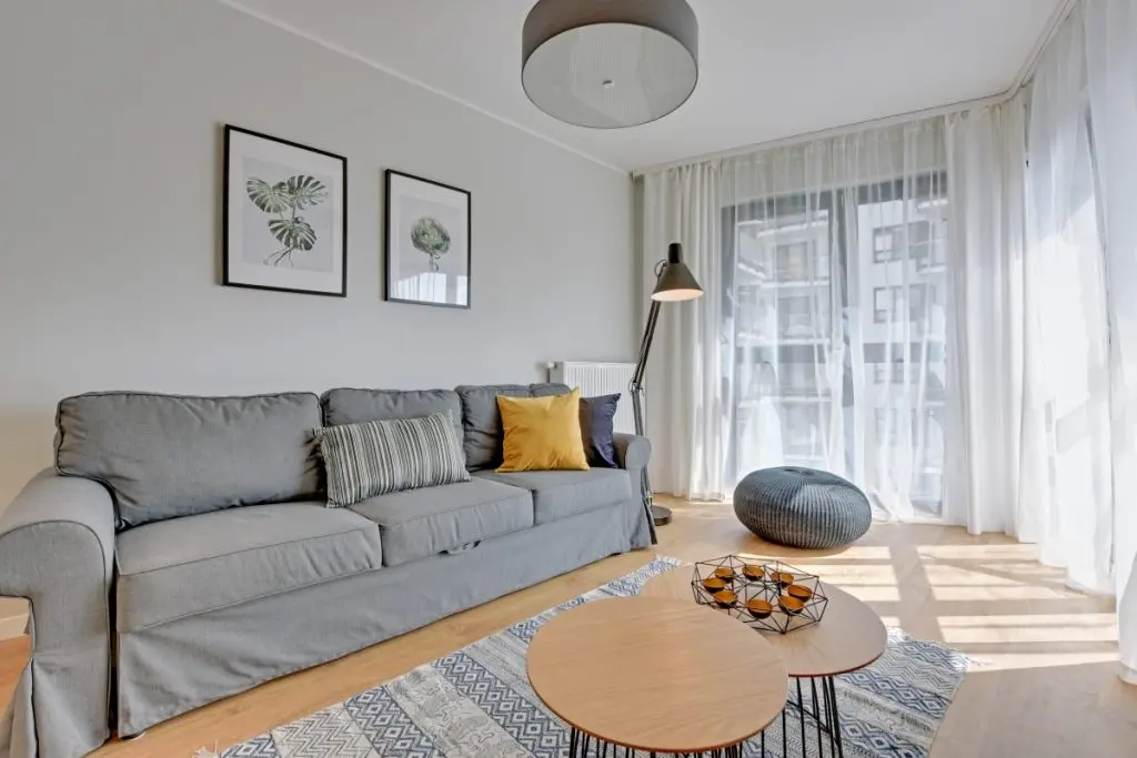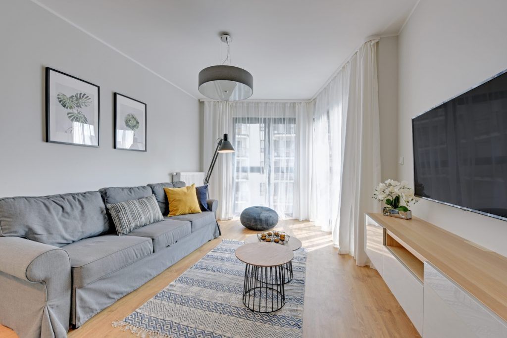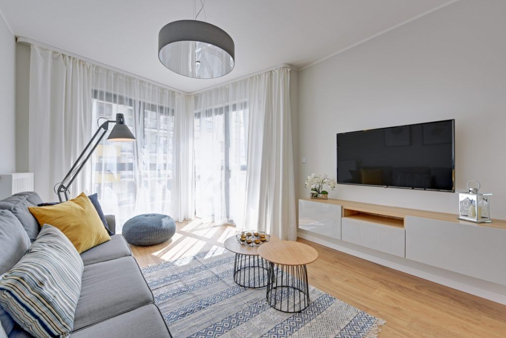 Living-ul se prezinta intr-o maniera scandinava, pozitionand central o canapea extensibila in nuante de gri, careia i se alatura o masa de cafea nonconformista, o biblioteca simpla si o perna cu rol de fotoliu. Cele doua zone permit luminii naturale sa inunde intreg spatiul, corpurile de iluminat artificial prezentandu-se modest.