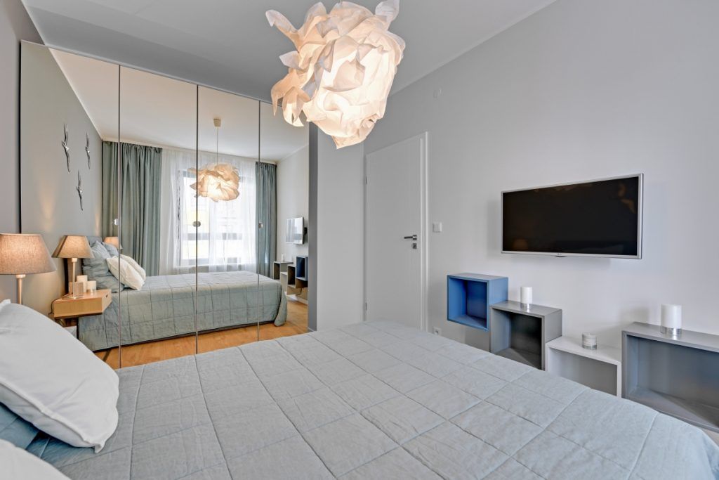 Dormitorul matrimonial scoate in evidenta detalii care aduc in prim plan o atmosfera romantica si odihnitoare. Patul dublu, in nuante de gri, se pozitioneaza central, iar in lateralul sau se remarca un dressing de mari dimensiuni, alcatuit in totalitate din oglinzi pentru asigurarea efectului de marire vizuala a incaperii.