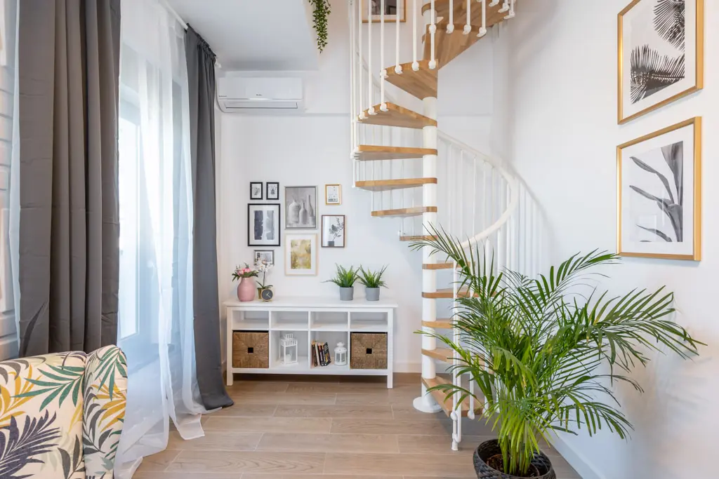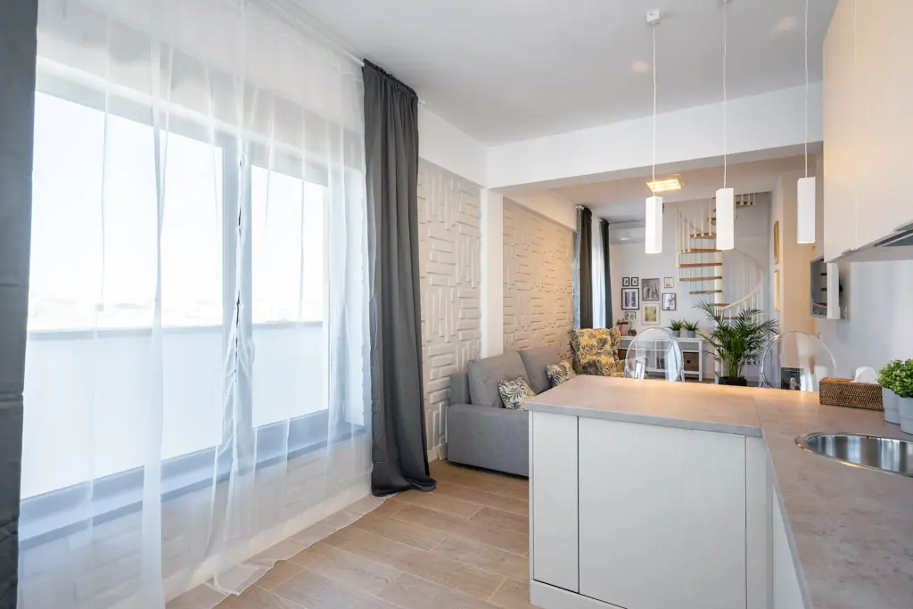 Deschide GaleriaPentru ca vorbim de o locuinta pe doua nivele, cu scara interioara, impartirea acesteia se face in doua zone de interes, ale caror spatii aflate in echilibru, sunt delimitate precis cu ajutorul pozitionarii mobilierului. Open space-ul compus din bucatarie, living, zona de dining si hol aduce in prim plan un ambient fresh, cu usoare influente scandinave. Senzatia de prospetime este accentuata de stejarul natural al treptelor scarii spiralate, componenta care, prin aspectul sau delicat si simplist, creeaza o legatura continua intre cele doua zone principale.