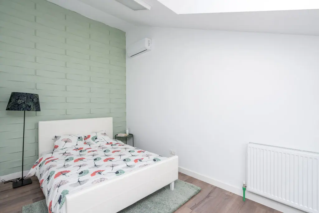 Spatiul de odihna se organizeaza intr-o mansarda functionala, pozitionand central un pat dublu, o noptiera metalica improvizata si un lampadar, toate in culori complementare. Pastelurile se imbina armonios in obtinerea unei imagini simpliste si relaxante. Ca si in cazul living-ului, detaliul 3D al peretelui este cel care sparge monotonia, oferind profunzime si unicitate incaperii.