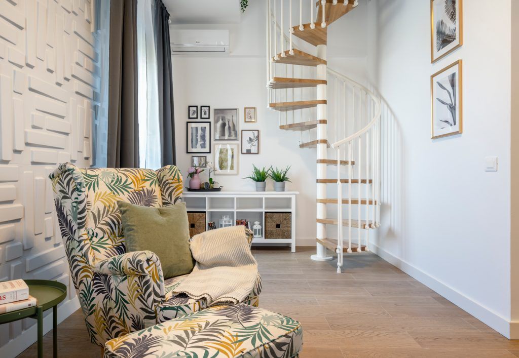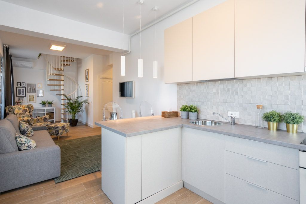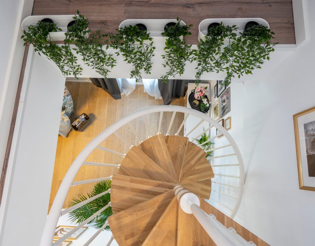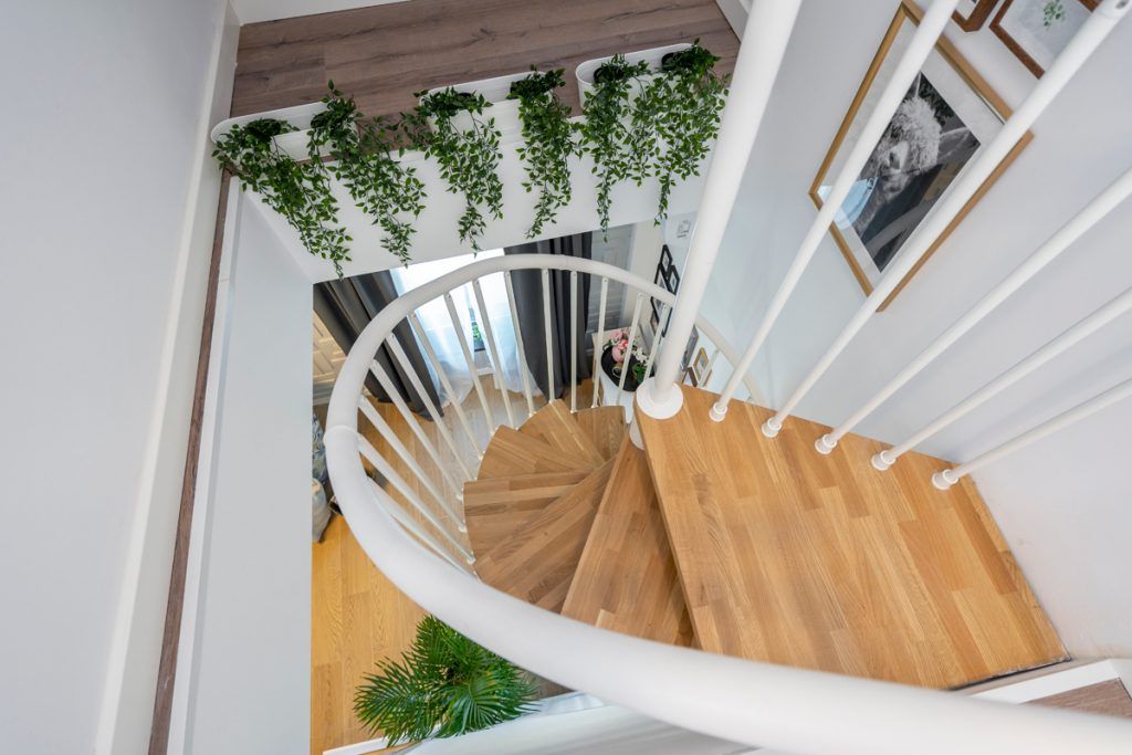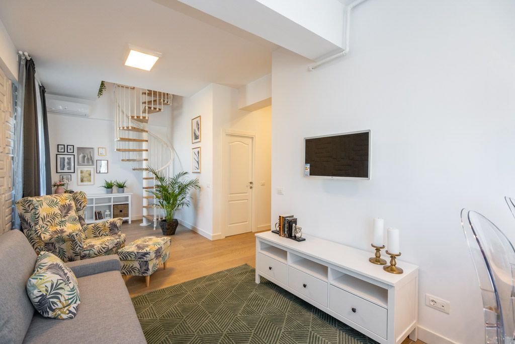 Deschide GaleriaPentru ca vorbim de o locuinta pe doua nivele, cu scara interioara, impartirea acesteia se face in doua zone de interes, ale caror spatii aflate in echilibru, sunt delimitate precis cu ajutorul pozitionarii mobilierului. Open space-ul compus din bucatarie, living, zona de dining si hol aduce in prim plan un ambient fresh, cu usoare influente scandinave. Senzatia de prospetime este accentuata de stejarul natural al treptelor scarii spiralate, componenta care, prin aspectul sau delicat si simplist, creeaza o legatura continua intre cele doua zone principale.