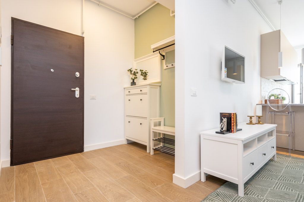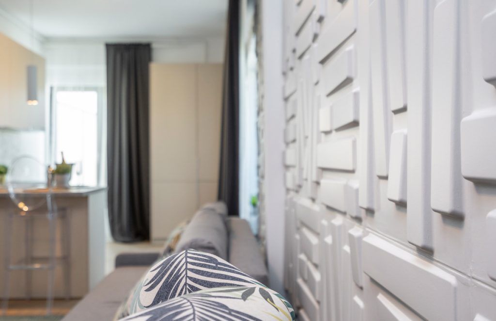 Simplitatea si naturaletea sunt punctele cheie in cazul acestei transformari, ajutand la adaugarea unui caracter practic dar si a unor elemente cu impact vizual, asa cum este in cazul accesoriilor. Pentru ca vorbim o locuinta atipica, inalta si ingusta, cantitatea impresionanta de alb, accentele de verde, gri si lemn, obtin un spatiu luminos, largit vizual, invaluit in prospetime. Mobilierul holului, compus dintr-un cuier, o comoda si o bancuta, impreuna cu cele doua comode ale living-ului, adauga o nota clasica ce se imbina perfect cu minimalismul exprimat de bucatarie, lasand sa se evidentieze accentul modern al peretelui 3D. In prim planul amenajarii se afla acest tip de element nou, reprezentat prin panourile 3D din trestie de zahar montate, vopsite si tratate cu materiale speciale pe baza de latex, o solutie la indemana pentru evidentierea unei transformari care se vrea a iesi din anonimat.