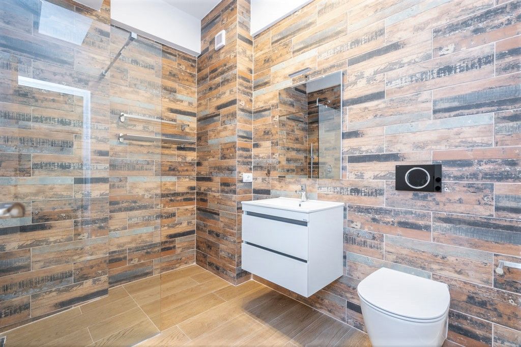 Din punct de vedere al cromaticii se observa o coordonare precisa intre toate incaperile locuintei, nuantele calde si restul accentelor regasindu-se si la etaj, acolo unde se afla cele doua dormitoare si baia secundara.In ceea ce priveste baile, se opteaza pentru un aspect geometric liniar, cu detalii marmorate, sticla, mobilier minimalist si componente sanitare moderne.