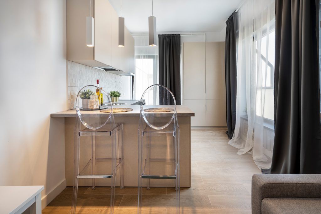 La toate aceste componente se adauga doua lampi de iluminat cu caracter nonconformist, un fotoliu si o canapea decorate cu pattern-uri exotice si doua scaune de bar din policarbonat transparent, toate aflate intr-o armonie eclectica. Largirea vizuala a spatiului si maximizarea luminozitatii se face prin eliberarea zonei din fata geamurilor, a caror dimensiune impresionanta permite evidentierea privelistii de care dispune apartamentul.