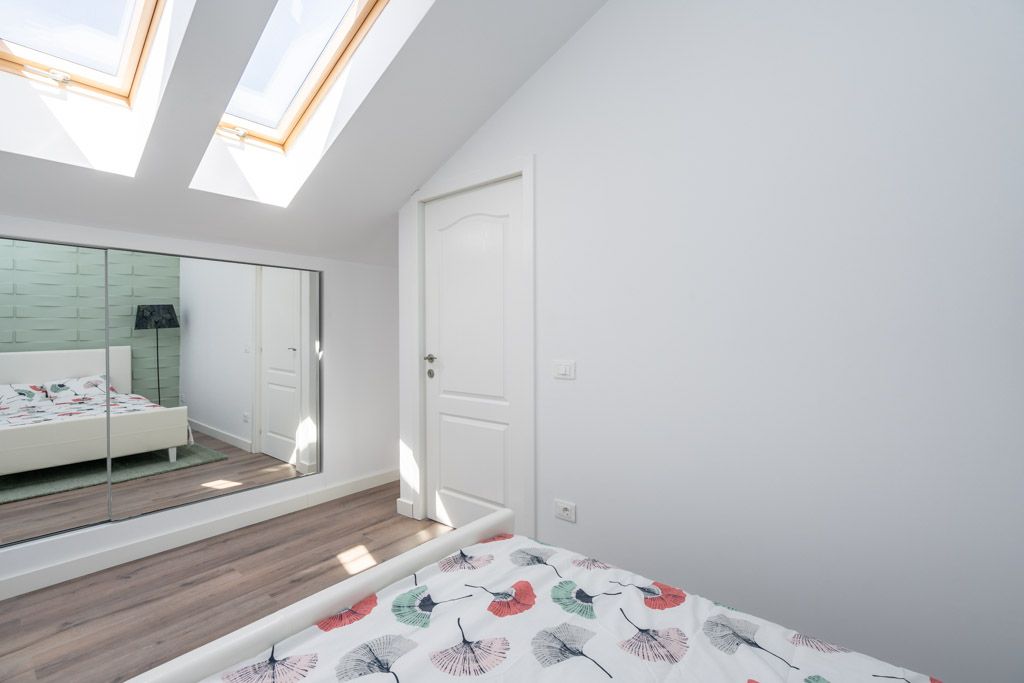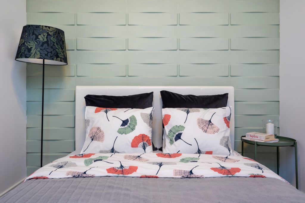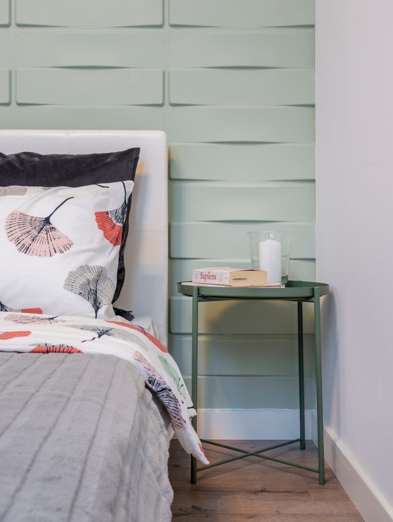 Spatiul de odihna se organizeaza intr-o mansarda functionala, pozitionand central un pat dublu, o noptiera metalica improvizata si un lampadar, toate in culori complementare. Pastelurile se imbina armonios in obtinerea unei imagini simpliste si relaxante. Ca si in cazul living-ului, detaliul 3D al peretelui este cel care sparge monotonia, oferind profunzime si unicitate incaperii.