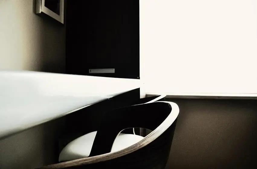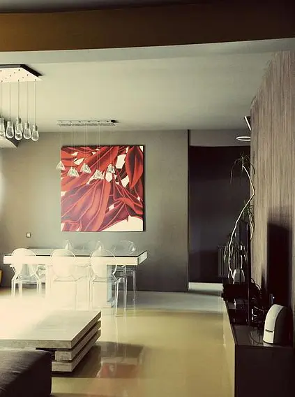 Fara doar si poate in acest apartament sistemul de iluminat impresioneaza prin design. Atat in sufragerie cat si in zona de dining au fost agatate manunchiuri de becuri care ofera amenajarii un aer neconventional. Scaunele transparente sunt realizate de catre celebrul designer Philippe Starck recunoscut pentru inovatiile pe care le aduce in acest domeniu.