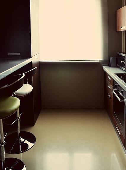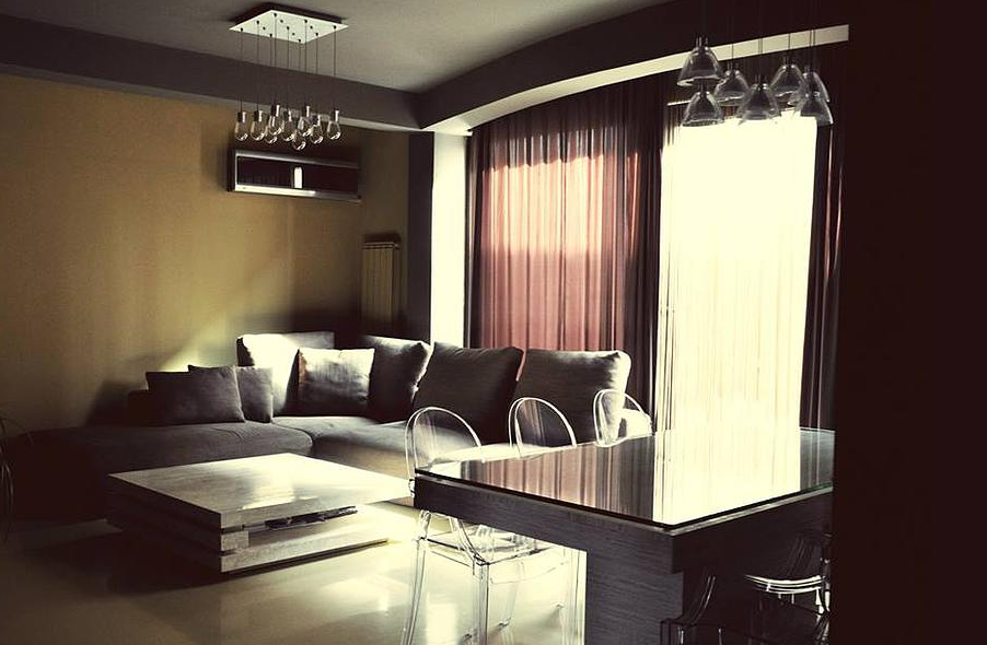 Fara doar si poate in acest apartament sistemul de iluminat impresioneaza prin design. Atat in sufragerie cat si in zona de dining au fost agatate manunchiuri de becuri care ofera amenajarii un aer neconventional. Scaunele transparente sunt realizate de catre celebrul designer Philippe Starck recunoscut pentru inovatiile pe care le aduce in acest domeniu.