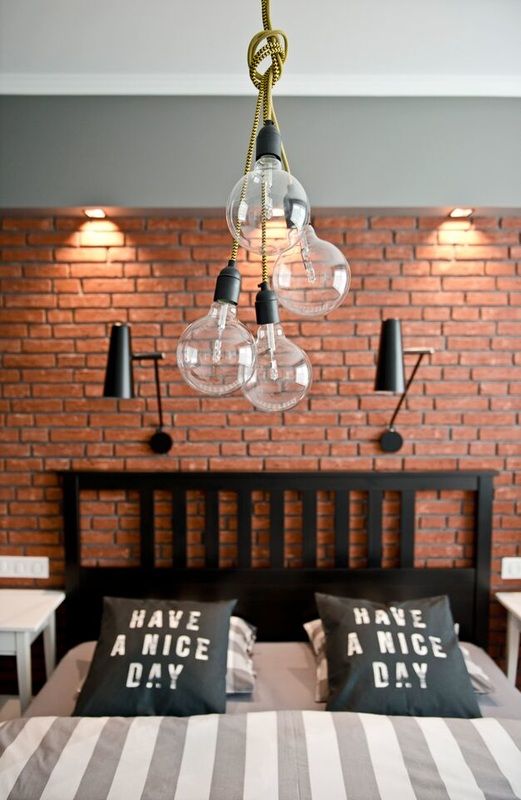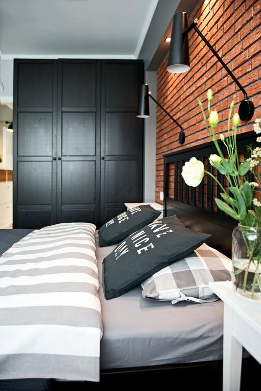 Dormitorul-birou pastreaza tematica albastrului-gri si averdelui-menta, iar insertiile de furnir de lemn in contrast cu finisajele albe, toate contureaza un spatiu creativ, placut. Dormitorul matrimonial il vom gasi mobilat cu strictul necesar, contrastul puternic intre caramida aparenta si negrul mobilierului fiind cu adevarat o imagine de impact.