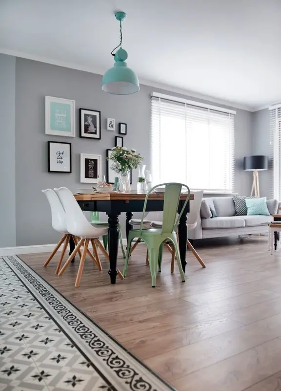 Trecerea spre living se face la nivel vizual prin cele doua tipuri de pardoseli si a nuantelor diferite cu care au fost zugraviti peretii. In zona bucatariei avem o pardoseala din placi ceramice, pentru ca mai apoi spre living sa avem parchet, plintele albe asigurand o unitate per ansamblu.