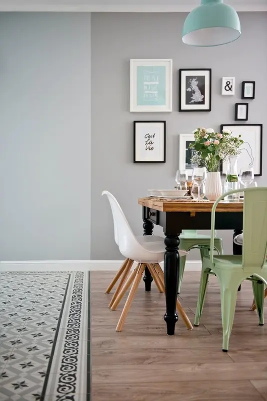 Tot in aceasta zona de trecere a fost amenajat diningul intr-un stil eclectic care se transpune in tematica spatiului. Scaune Eames si scaune Tolix, o masa cu picioare in stil clasic si blat de lemn brut si un corp de iluminat industrial.