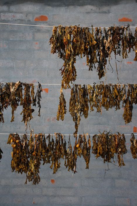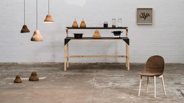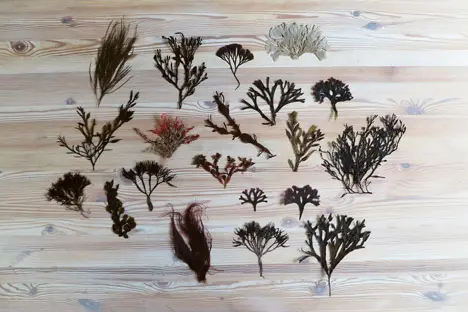 Deschide GaleriaAlgele au fost mai intai uscate si apoi macinate pana la stadiul de pulbere. Ulterior sunt preparate termic pentru a exploata la maxim un tip de clei numit alginat, un polimer natural care se gaseste in algele brune. Combinand apoi cleiul cu hartia rezulta un material rezistent asemanator cu pluta, care poate fi modelat pentru a crea produse ce pot fi regasite in colectia Terroir Project.