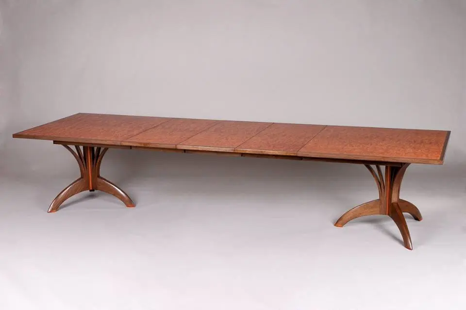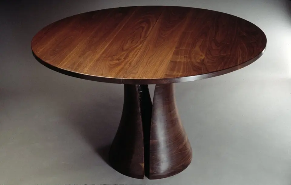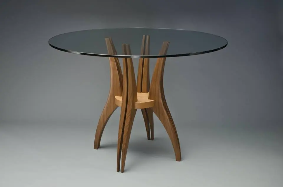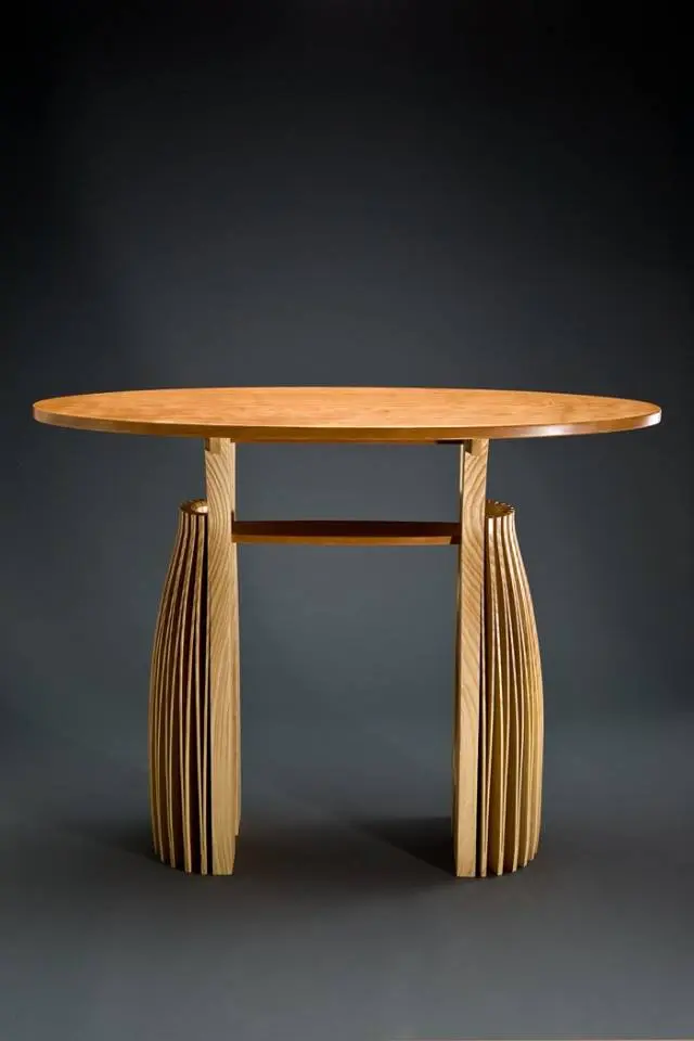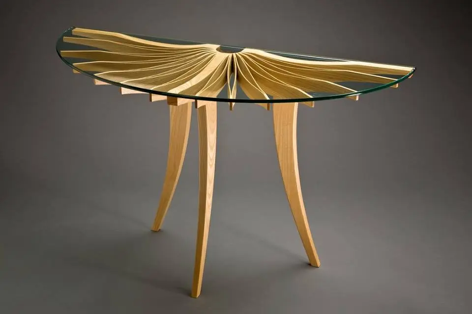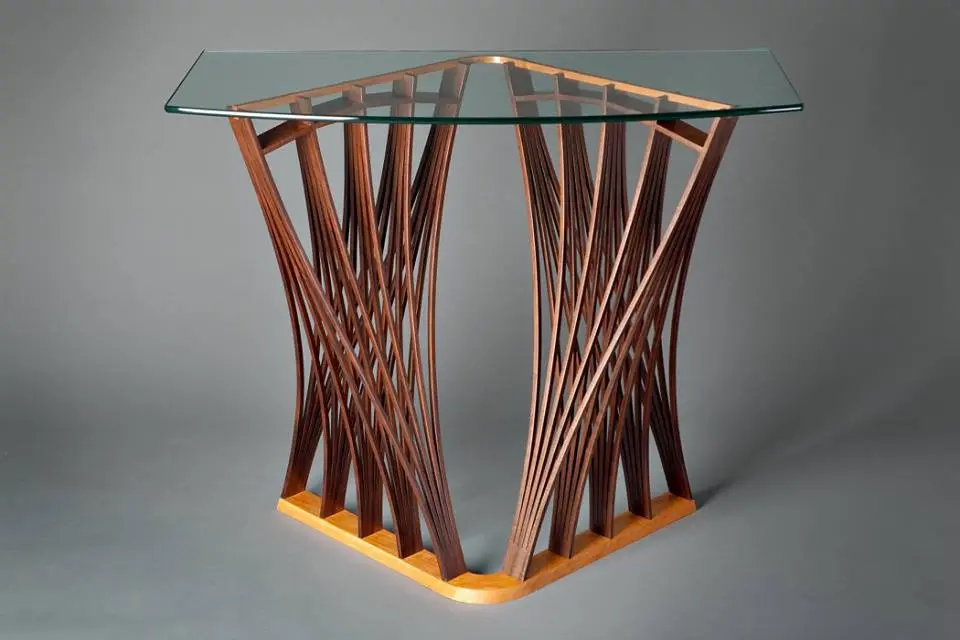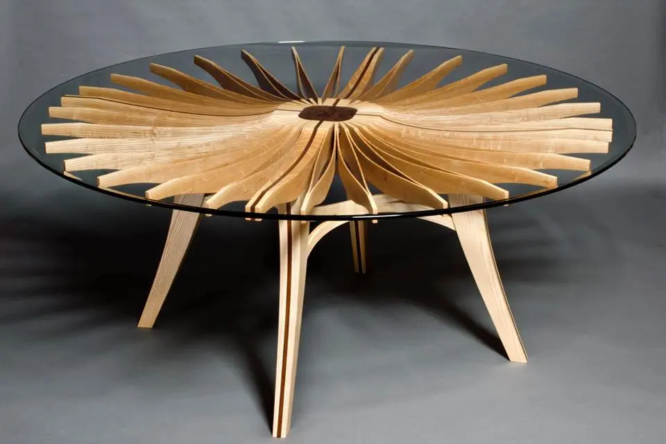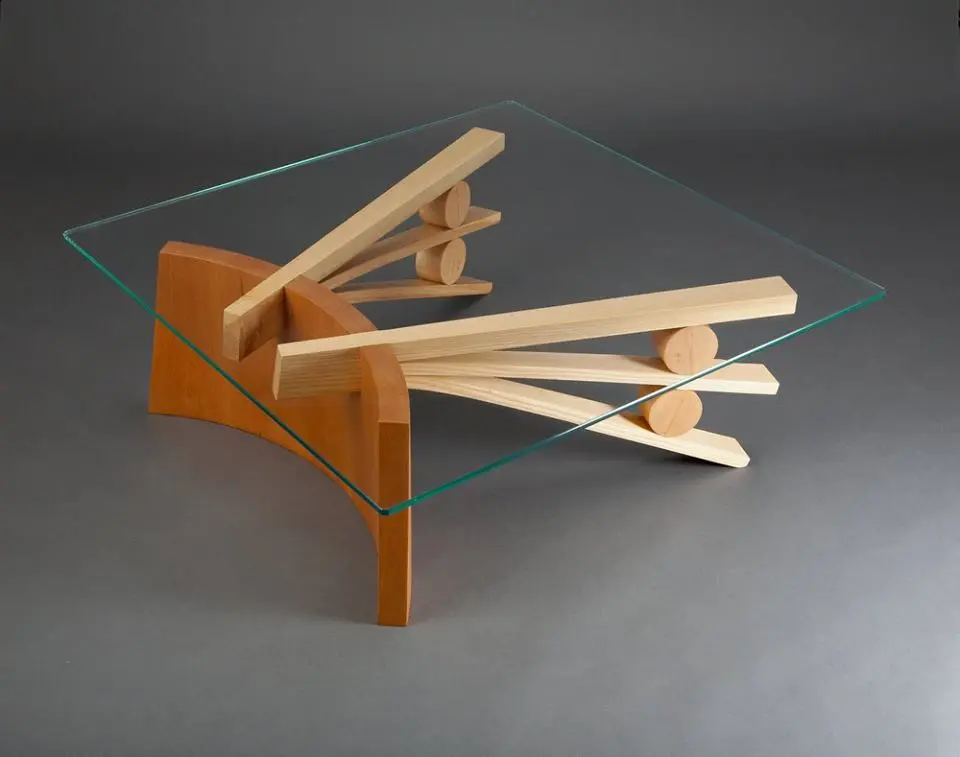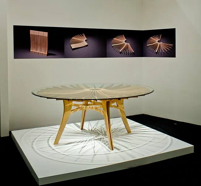 Sub suprafata din sticla, blatul este o singura bucata de lemn de frasin. Designerul a decupat taieturi partiale si alternative de la un capat la celalat, dupa care a desfacut blatul ca pe un acordeon. Tensiunile create prin aceasta deschidere creeaza un blat solid si functional. Formele decorative ale decupajelor sunt subliniate de jocul dintre lumini si umbre pe care le creeaza.