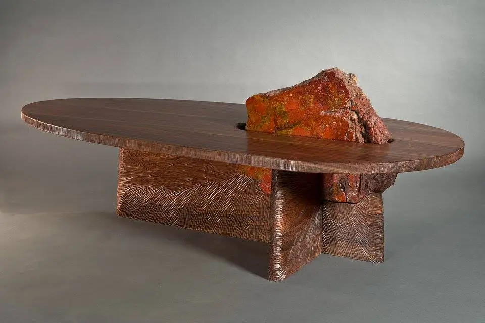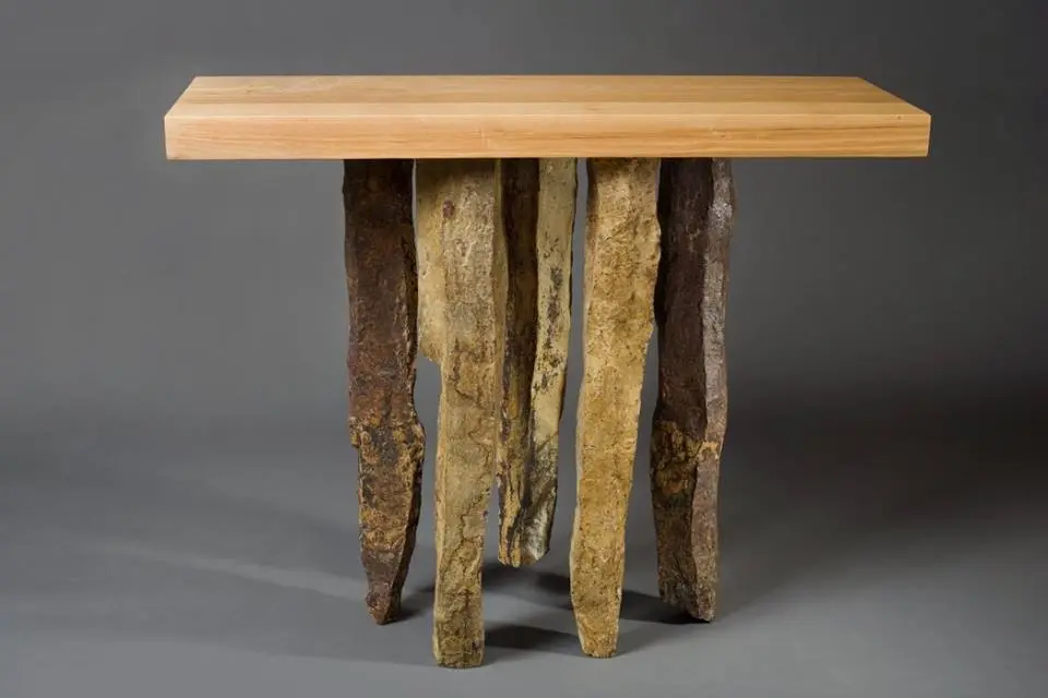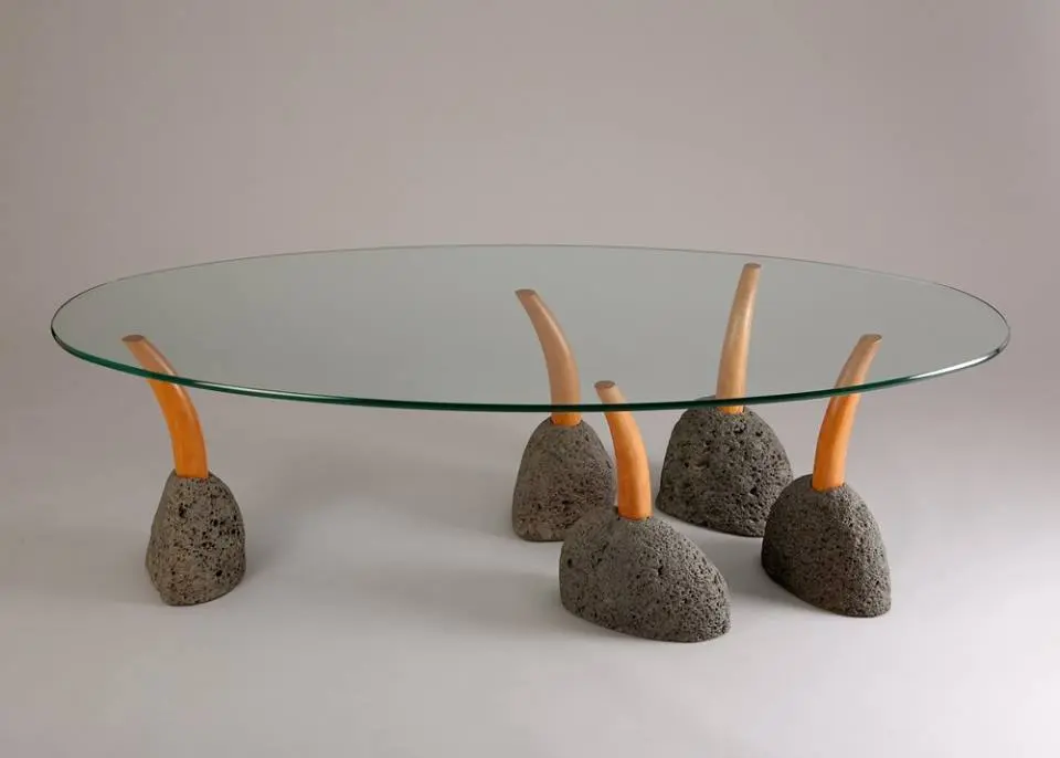 Pe post de picioare, Rolland a folosit doua pietre cu forme naturale. Fiecare piatra a fost forata pentru a sustine picioarele curbate din lemn de cires pe care se sprijina blatul din sticla. Trei dintre acestea au o inaltime fixa, iar celelalte doua sunt ajustabile, astfel incat, ele vor sustine blatul chiar daca podeaua este denivelata. De asemenea, plasarea pietrelor se poate schimba, iar picoarele din lemn se pot roti.