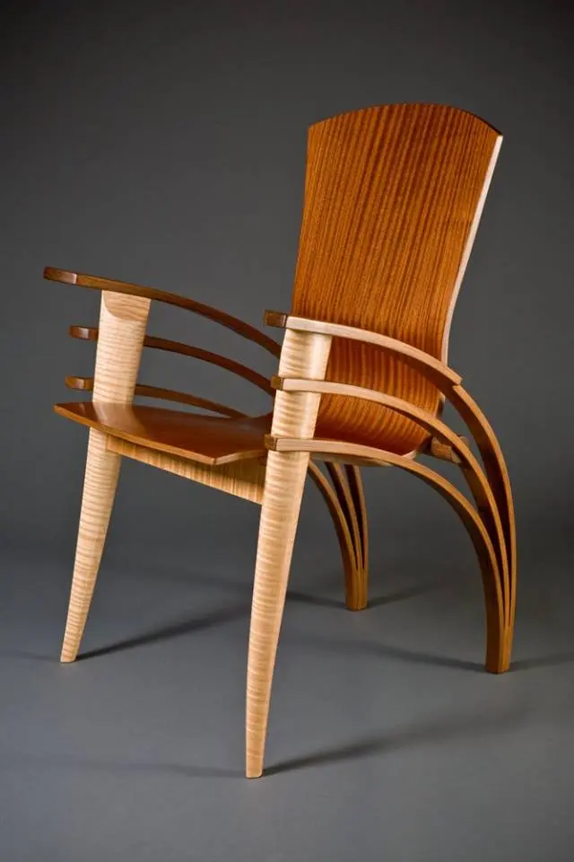Bratele triple sunt din lemn de nuc, picioarele din fata sunt sculptate din artar, iar blatul de stat este vid, format din 19 straturi de furnir. Aceasta tehnica permite ca scaunul sa fie, in acelasi timp, si rezistent si usor. Spatarul este flexibil pentru a te putea balansa pe el, ceea ce inseamna ca e si foarte confortabil. Scaunul poate fi folosit atat pentru birou cat si pentru masa din bucatarie.