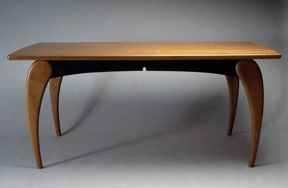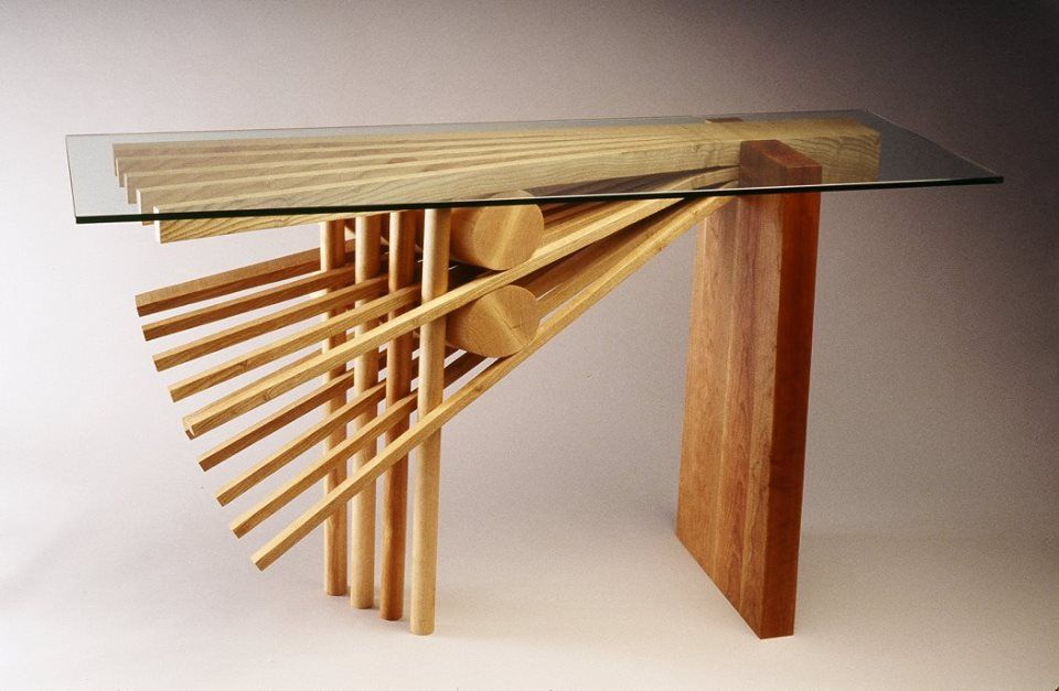 Sub suprafata din sticla, blatul este o singura bucata de lemn de frasin. Designerul a decupat taieturi partiale si alternative de la un capat la celalat, dupa care a desfacut blatul ca pe un acordeon. Tensiunile create prin aceasta deschidere creeaza un blat solid si functional. Formele decorative ale decupajelor sunt subliniate de jocul dintre lumini si umbre pe care le creeaza.